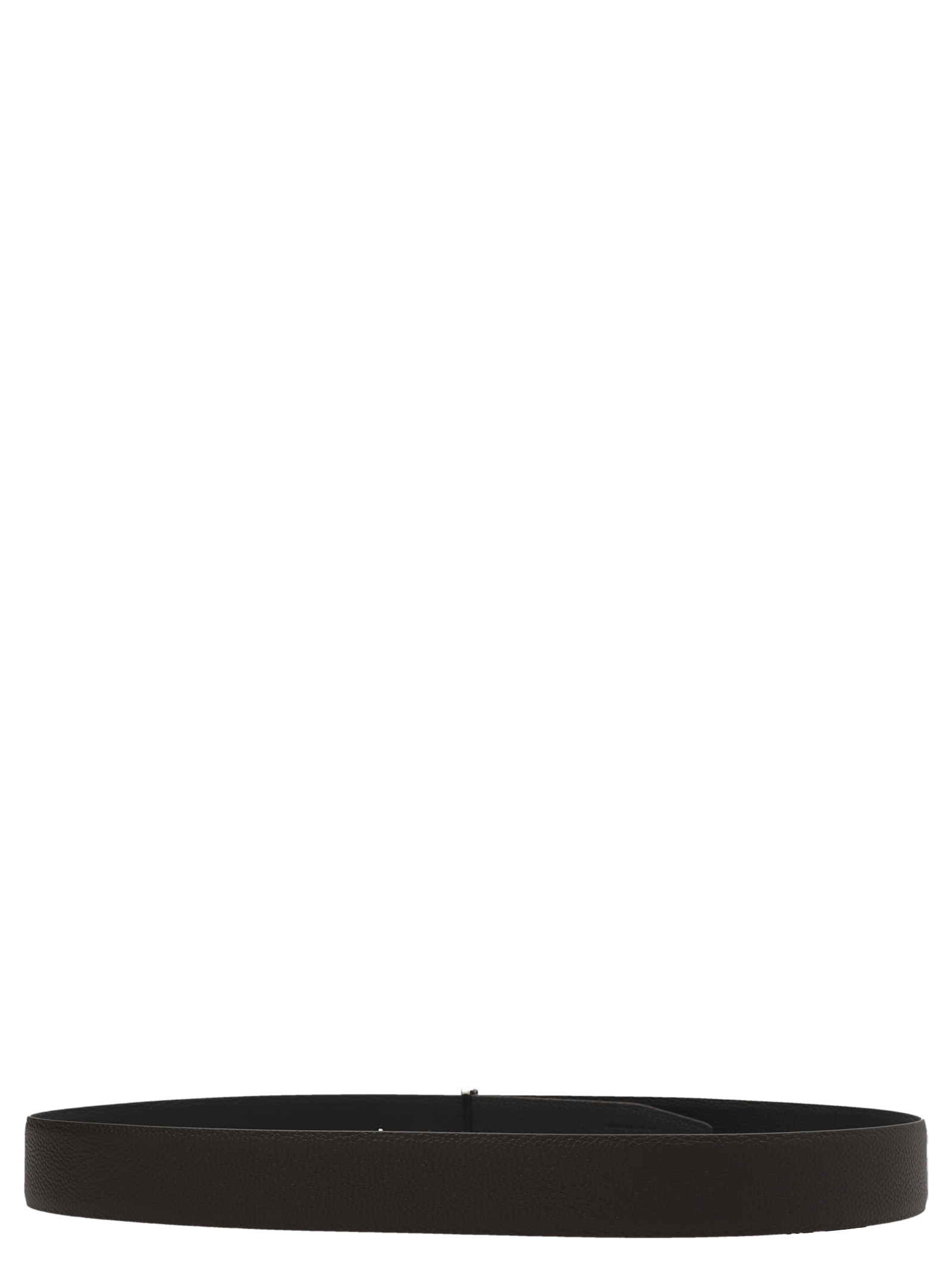 Черный и коричневый кожаный двусторонний ремень с металлической пряжкой.