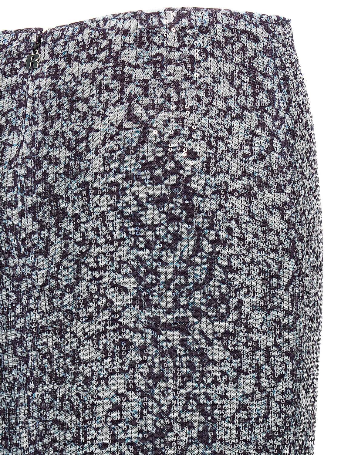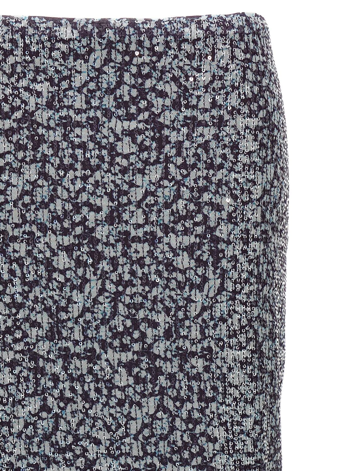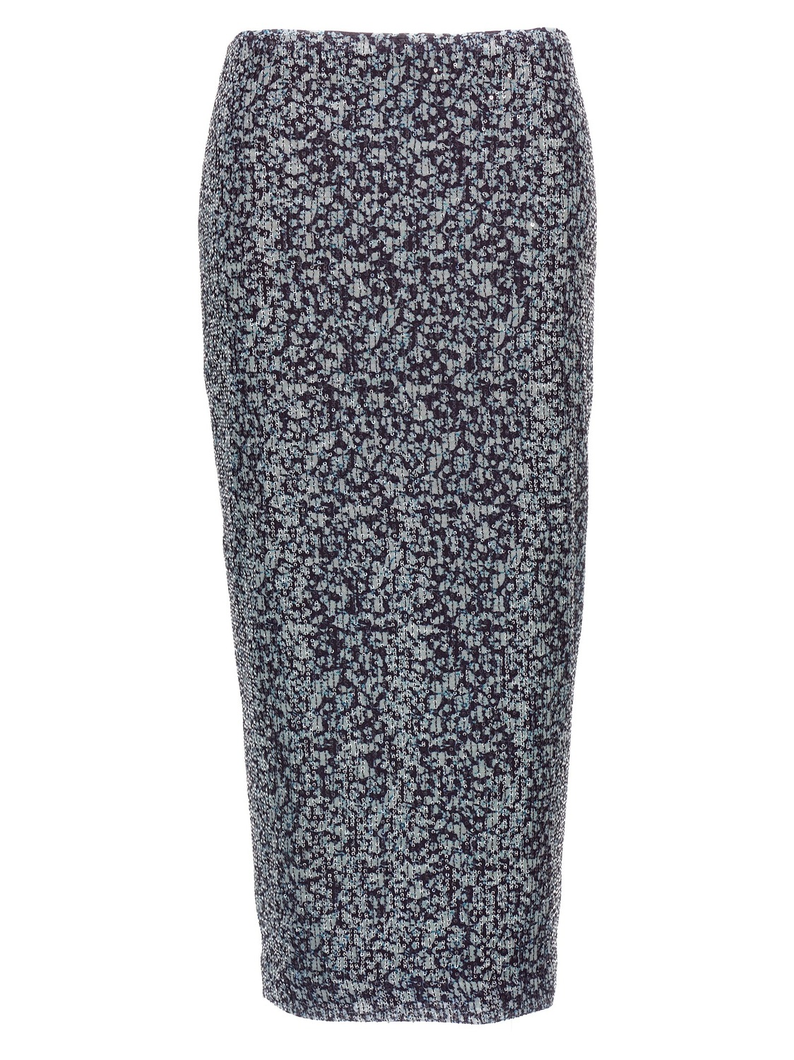 Юбка-карандаш миди из принтованной ткани с пайетками по всей поверхности, разрезом и застежкой на молнии сзади.