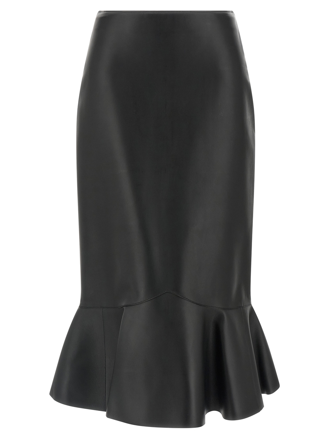 Юбка-миди из наппы, высокая талия, расклешенный силуэт с баской и воланами, застежка-молния сзади, подкладка.