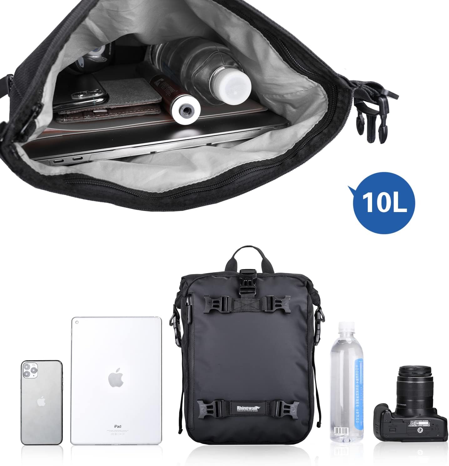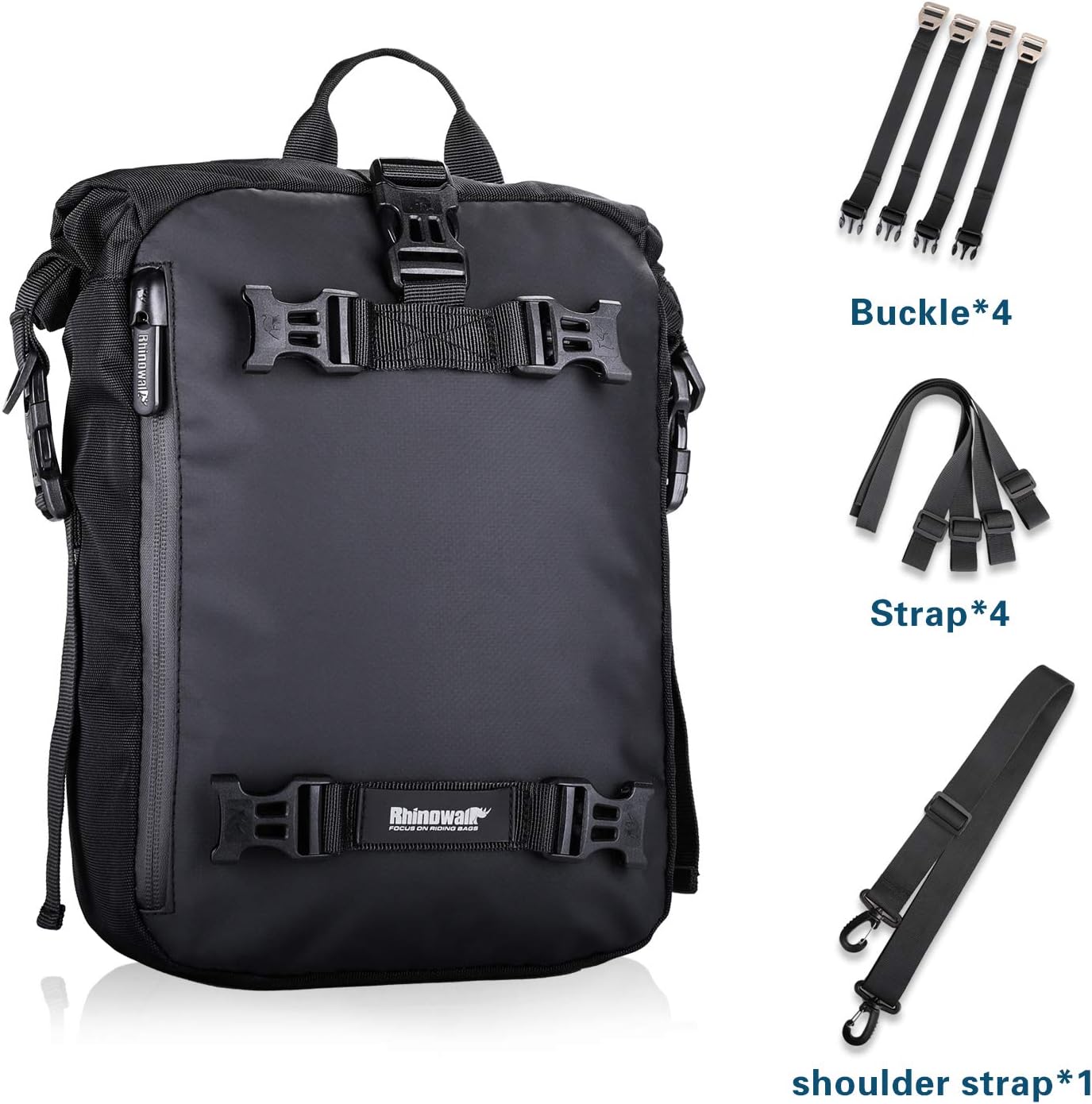 • Водонепроницаемая крышка молнии предотвращает попадание дождя, петли-крючки позволяют соединить сумки с другими сумками. Пряжки прочные и долговечные; лямки позволяют вешать предметы; серебристый светоотражающий логотип делает вождение в ночное время более безопасным.
