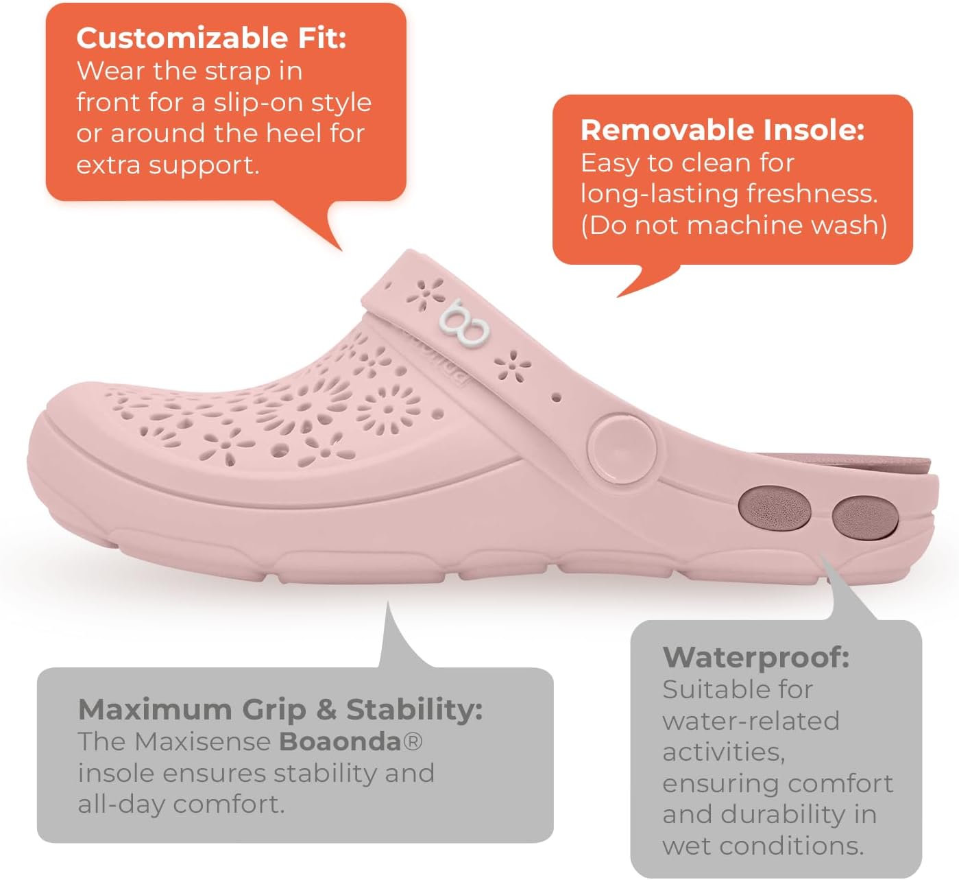 Легкий и гибкий дизайн: Эти женские сабо изготовлены из гибкой резины, обеспечивая мягкую и комфортную посадку. Их легкая конструкция гарантирует удобство на весь день, делая их идеальными для любого случая. Универсальный и регулируемый ремешок: Носите их так, как вам удобно! Эти сабо оснащены регулируемым ремешком, который можно поместить спереди для удобного надевания или сзади на щиколотке для дополнительной поддержки и устойчивости. Инновационная система слива воды: Сабо Boaonda Nellie выделяются отверстиями для слива воды в подошве, которые быстро выводят воду, сохраняя ваши ноги сухими. Идеально подходят для влажных условий, эти удобные садовые сабо водонепроницаемы и дышащие для ношения в течение всего дня. Кроме того, их легко чистить подошва съемная и подходит для ручной стирки для дополнительного удобства. Превосходный комфорт и сцепление: Оснащены подошвой Maxisense Boaonda, специально разработанной для улучшения комфорта и устойчивости.