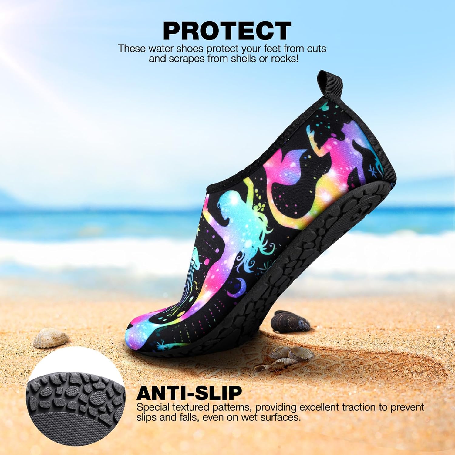 Комфортная ткань: Верхняя часть водных обуви сделана из гладкого и эластичного материала, который дышащий, эластичный и быстро высыхает. Они мягкие, как носки, идеально подходят по ноге. Гладкий и гибкий дизайн обуви для босоногой ходьбы защищает ваши лодыжки и облегчает надевание и снятие. Разнообразные стили и размеры: Водные носки SIMARI доступны в различных стилях, включая разнообразные принты и насыщенные цвета, позволяя выбрать стиль, который лучше всего соответствует вашим личным предпочтениям и случаю. Наши водные туфли для женщин и мужчин представлены в различных вариантах размеров, чтобы соответствовать разным потребностям ног мужчин и женщин, мальчиков и девочек. В описании продукта мы предоставляем таблицу размеров, чтобы помочь вам точно выбрать подходящий размер. Защитные: Наши пляжные туфли защищают ваши ноги со всех сторон. Подошва изготовлена из материала TPR, она прочная и долговечная.