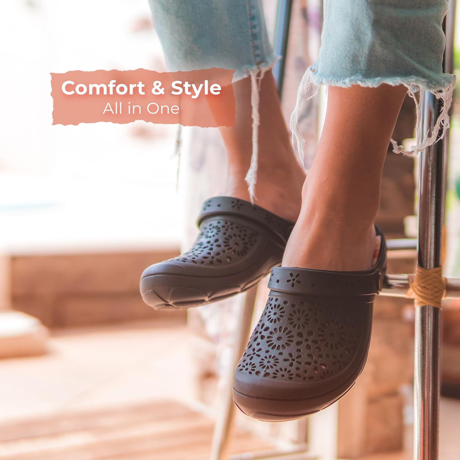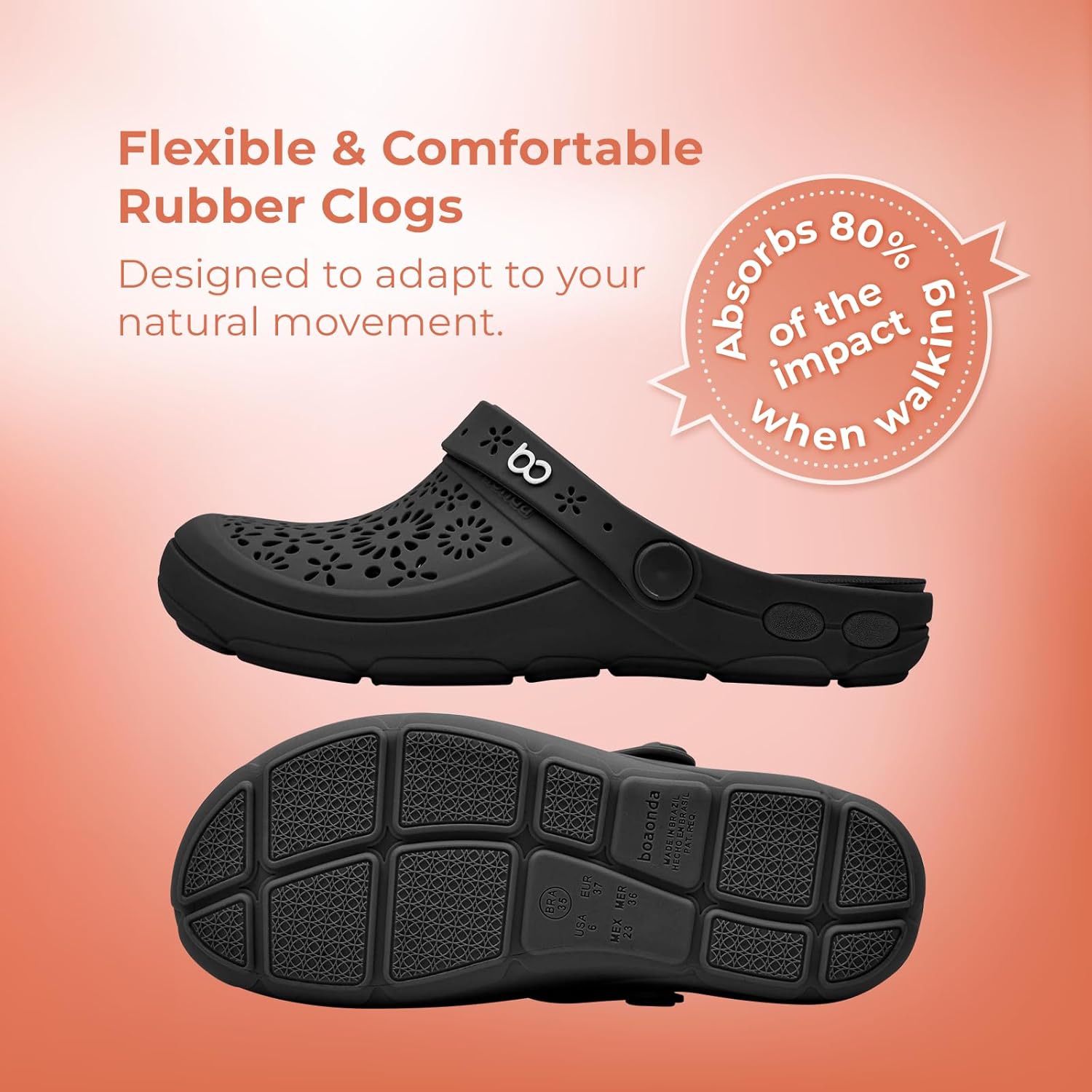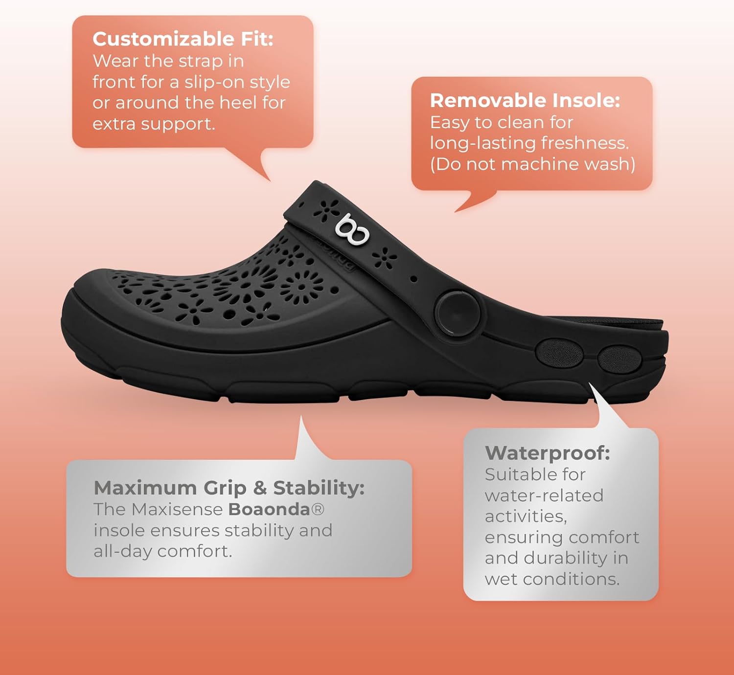 Легкий и гибкий дизайн: Эти женские сабо изготовлены из гибкой резины, обеспечивая мягкую и комфортную посадку. Их легкая конструкция гарантирует удобство на весь день, делая их идеальными для любого случая. Универсальный и регулируемый ремешок: Носите их так, как вам удобно! Эти сабо оснащены регулируемым ремешком, который можно поместить спереди для удобного надевания или сзади на щиколотке для дополнительной поддержки и устойчивости. Инновационная система слива воды: Сабо Boaonda Nellie выделяются отверстиями для слива воды в подошве, которые быстро выводят воду, сохраняя ваши ноги сухими. Идеально подходят для влажных условий, эти удобные садовые сабо водонепроницаемы и дышащие для ношения в течение всего дня. Кроме того, их легко чистить подошва съемная и подходит для ручной стирки для дополнительного удобства. Превосходный комфорт и сцепление: Оснащены подошвой Maxisense Boaonda, специально разработанной для улучшения комфорта и устойчивости.