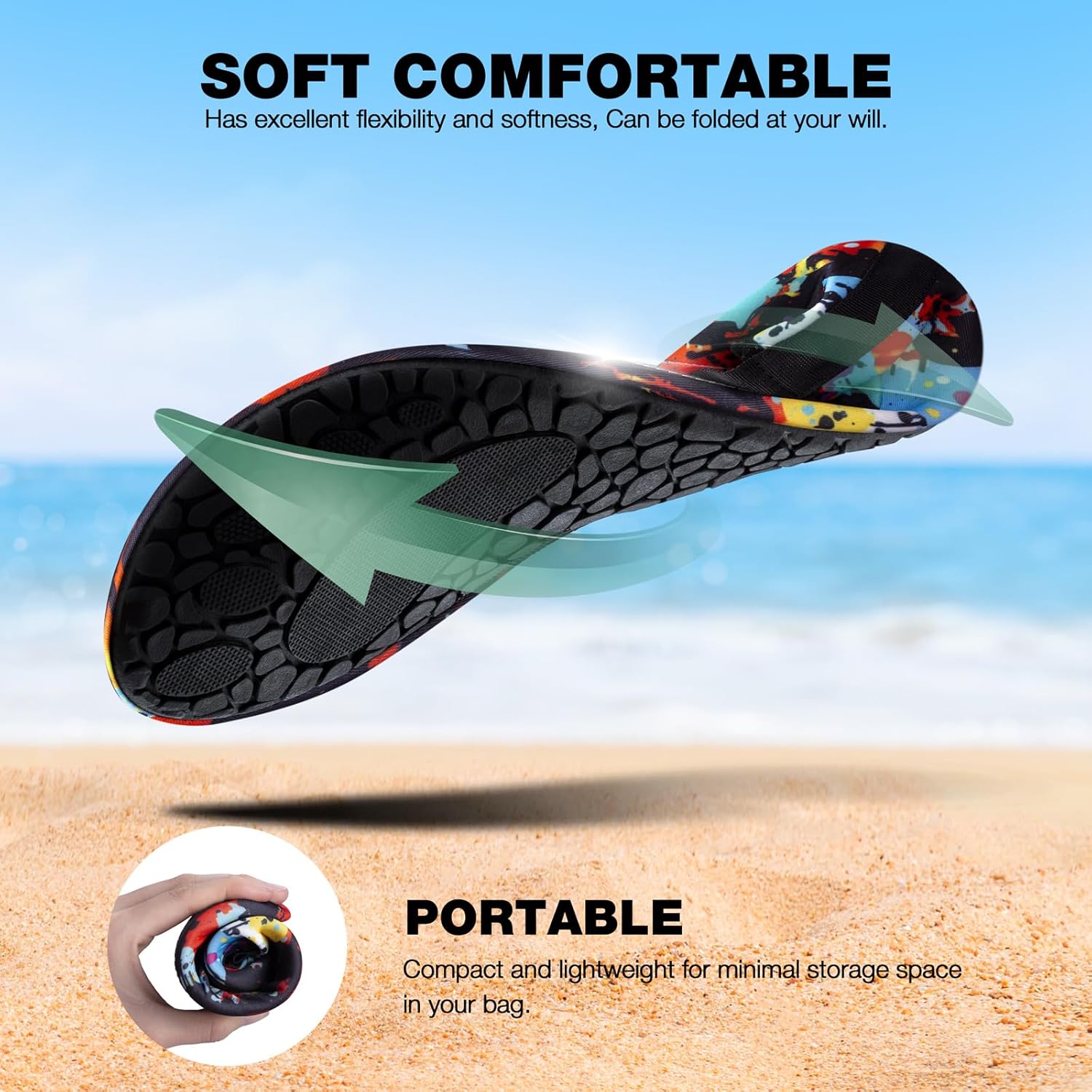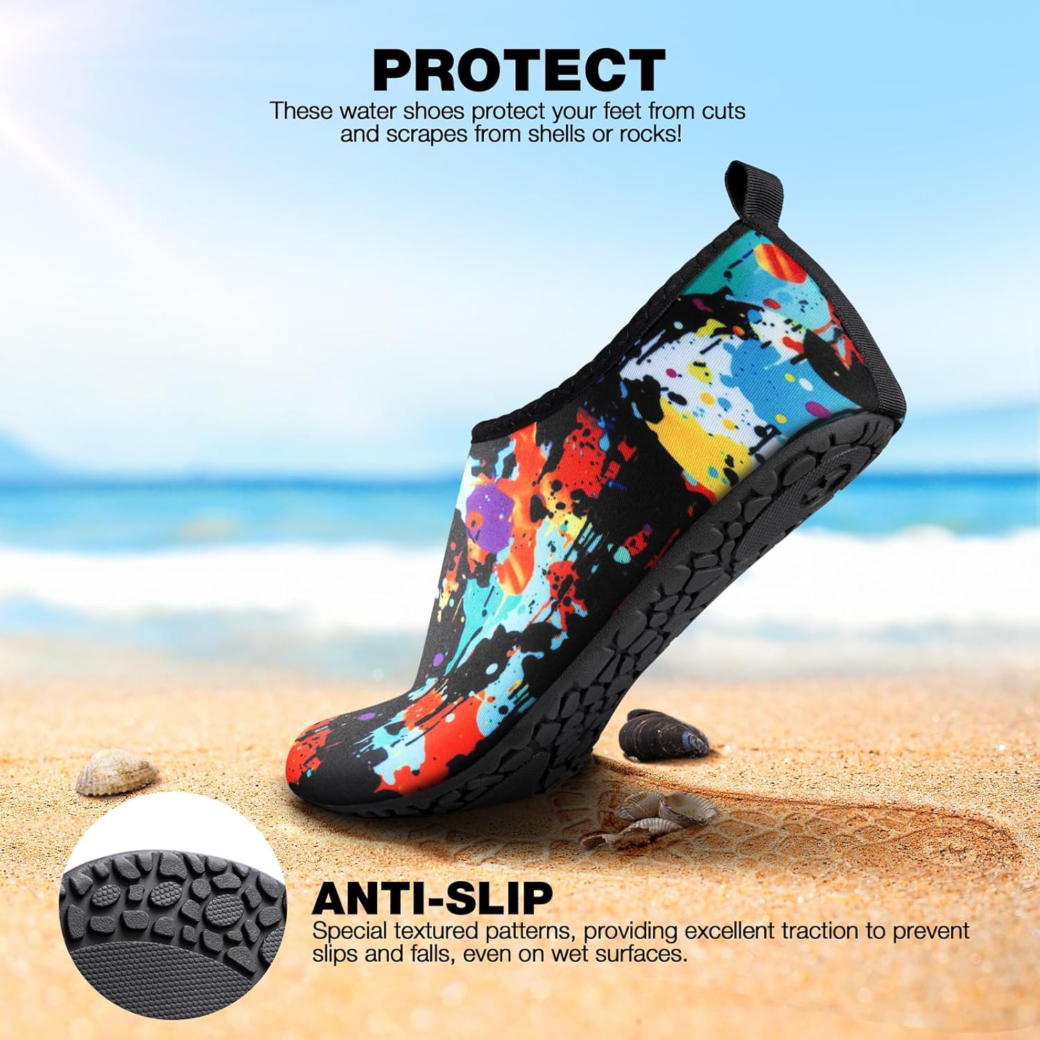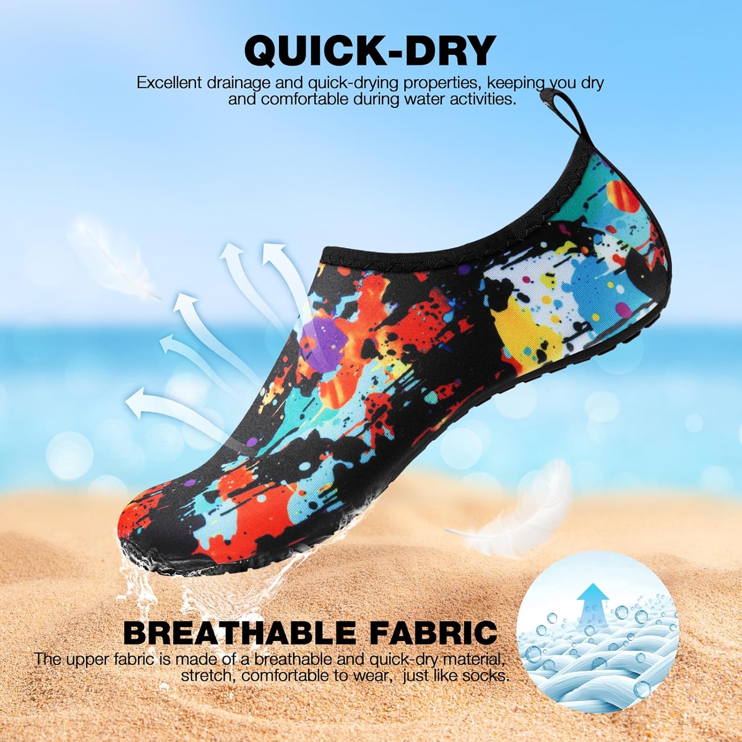Комфортная ткань: Верхняя часть водных обуви сделана из гладкого и эластичного материала, который дышащий, эластичный и быстро высыхает. Они мягкие, как носки, идеально подходят по ноге. Гладкий и гибкий дизайн обуви для босоногой ходьбы защищает ваши лодыжки и облегчает надевание и снятие. Разнообразные стили и размеры: Водные носки SIMARI доступны в различных стилях, включая разнообразные принты и насыщенные цвета, позволяя выбрать стиль, который лучше всего соответствует вашим личным предпочтениям и случаю. Наши водные туфли для женщин и мужчин представлены в различных вариантах размеров, чтобы соответствовать разным потребностям ног мужчин и женщин, мальчиков и девочек. В описании продукта мы предоставляем таблицу размеров, чтобы помочь вам точно выбрать подходящий размер. Защитные: Наши пляжные туфли защищают ваши ноги со всех сторон. Подошва изготовлена из материала TPR, она прочная и долговечная.
