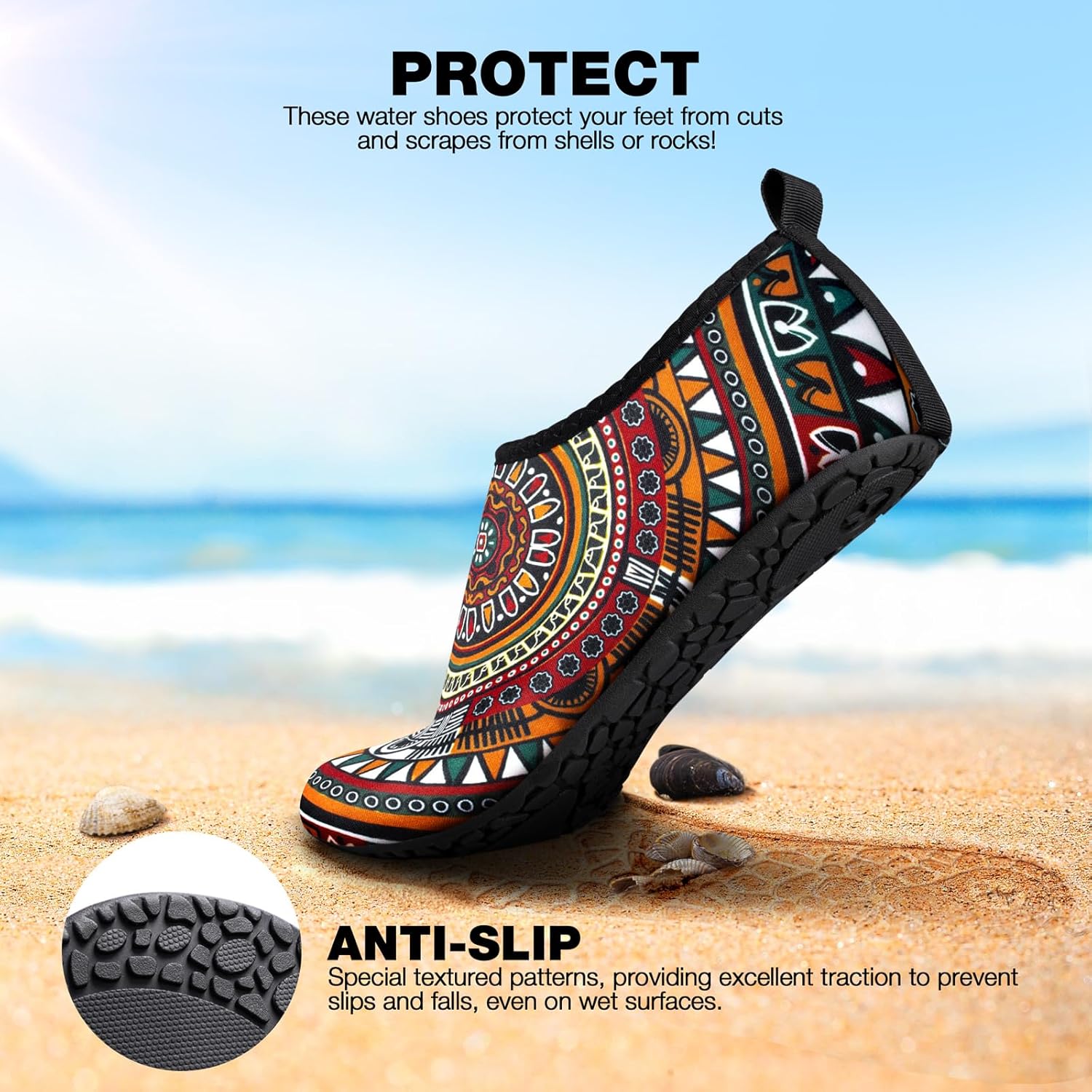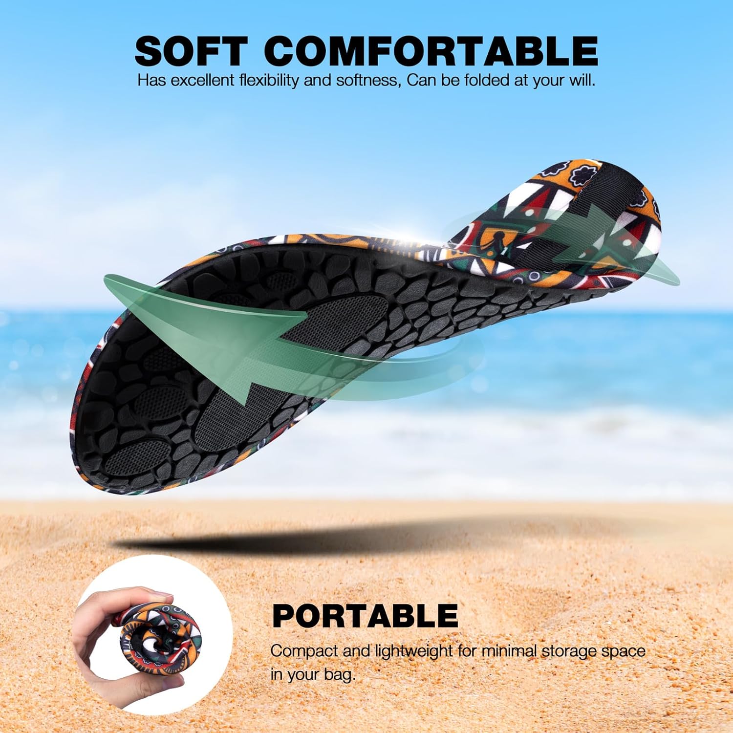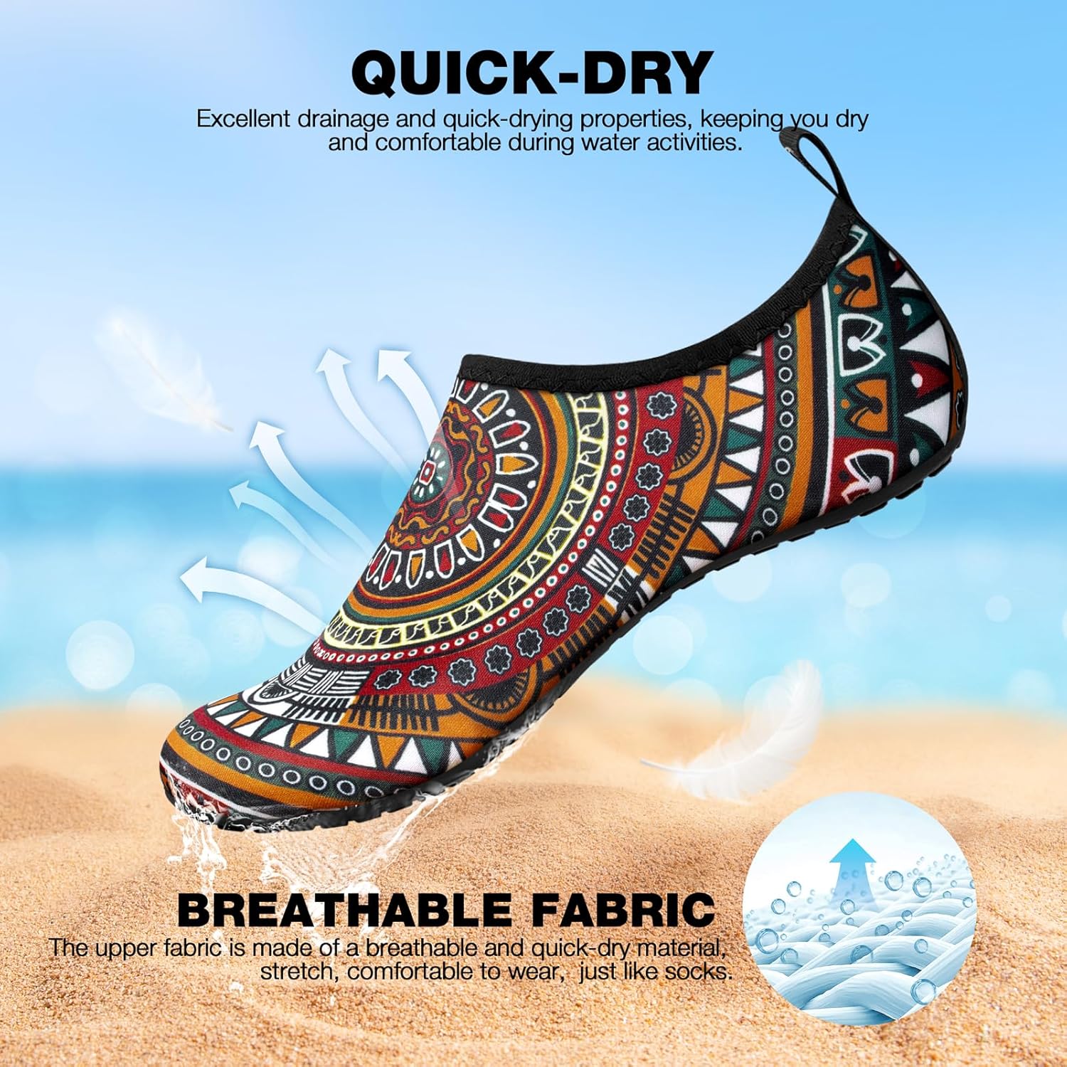 Комфортная ткань: Верхняя часть водных обуви сделана из гладкого и эластичного материала, который дышащий, эластичный и быстро высыхает. Они мягкие, как носки, идеально подходят по ноге. Гладкий и гибкий дизайн обуви для босоногой ходьбы защищает ваши лодыжки и облегчает надевание и снятие. Разнообразные стили и размеры: Водные носки SIMARI доступны в различных стилях, включая разнообразные принты и насыщенные цвета, позволяя выбрать стиль, который лучше всего соответствует вашим личным предпочтениям и случаю. Наши водные туфли для женщин и мужчин представлены в различных вариантах размеров, чтобы соответствовать разным потребностям ног мужчин и женщин, мальчиков и девочек. В описании продукта мы предоставляем таблицу размеров, чтобы помочь вам точно выбрать подходящий размер. Защитные: Наши пляжные туфли защищают ваши ноги со всех сторон. Подошва изготовлена из материала TPR, она прочная и долговечная.