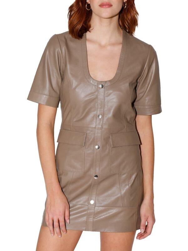 Платье Harlynn от Walter Baker выполнено из гладкой кожаной ткани с приталенным силуэтом. Перед украшен декоративными серебристыми пуговицами и карманами с клапанами.