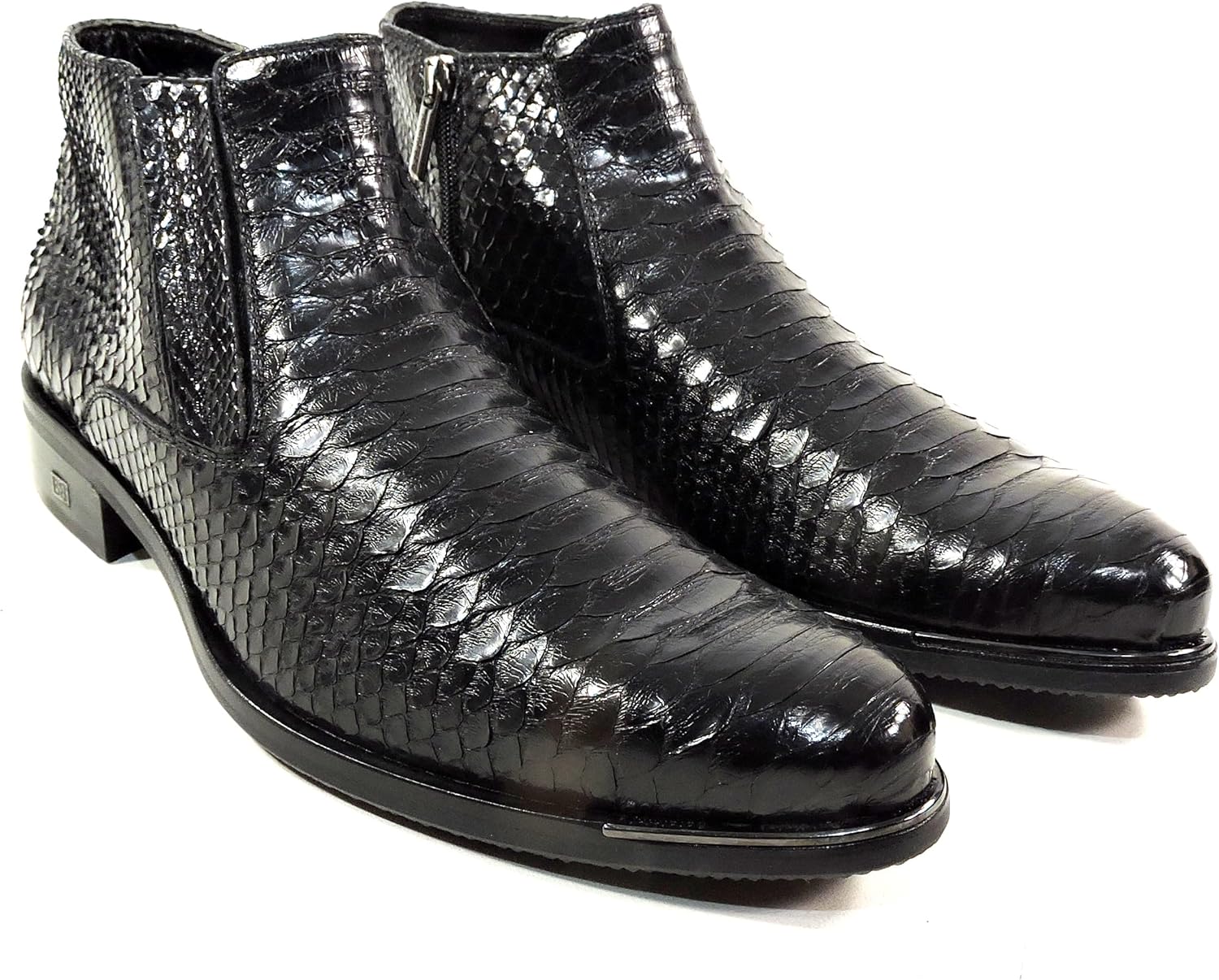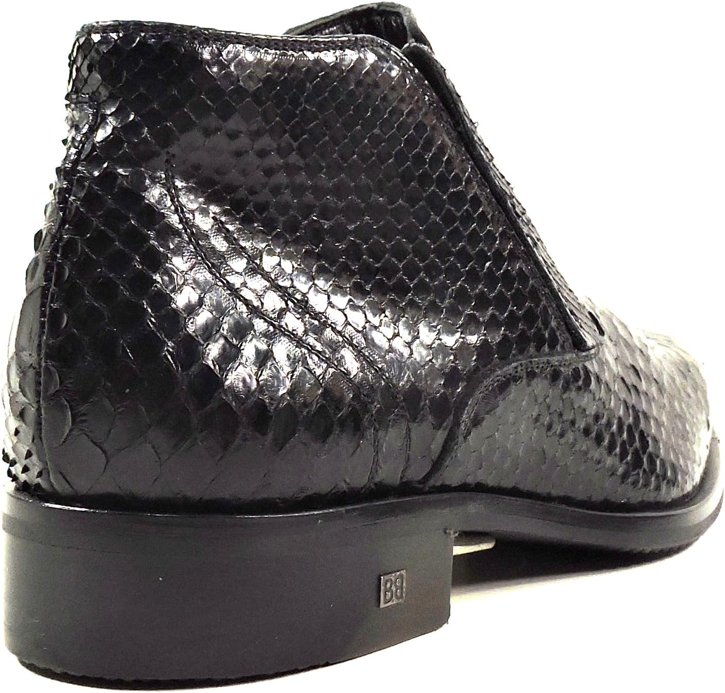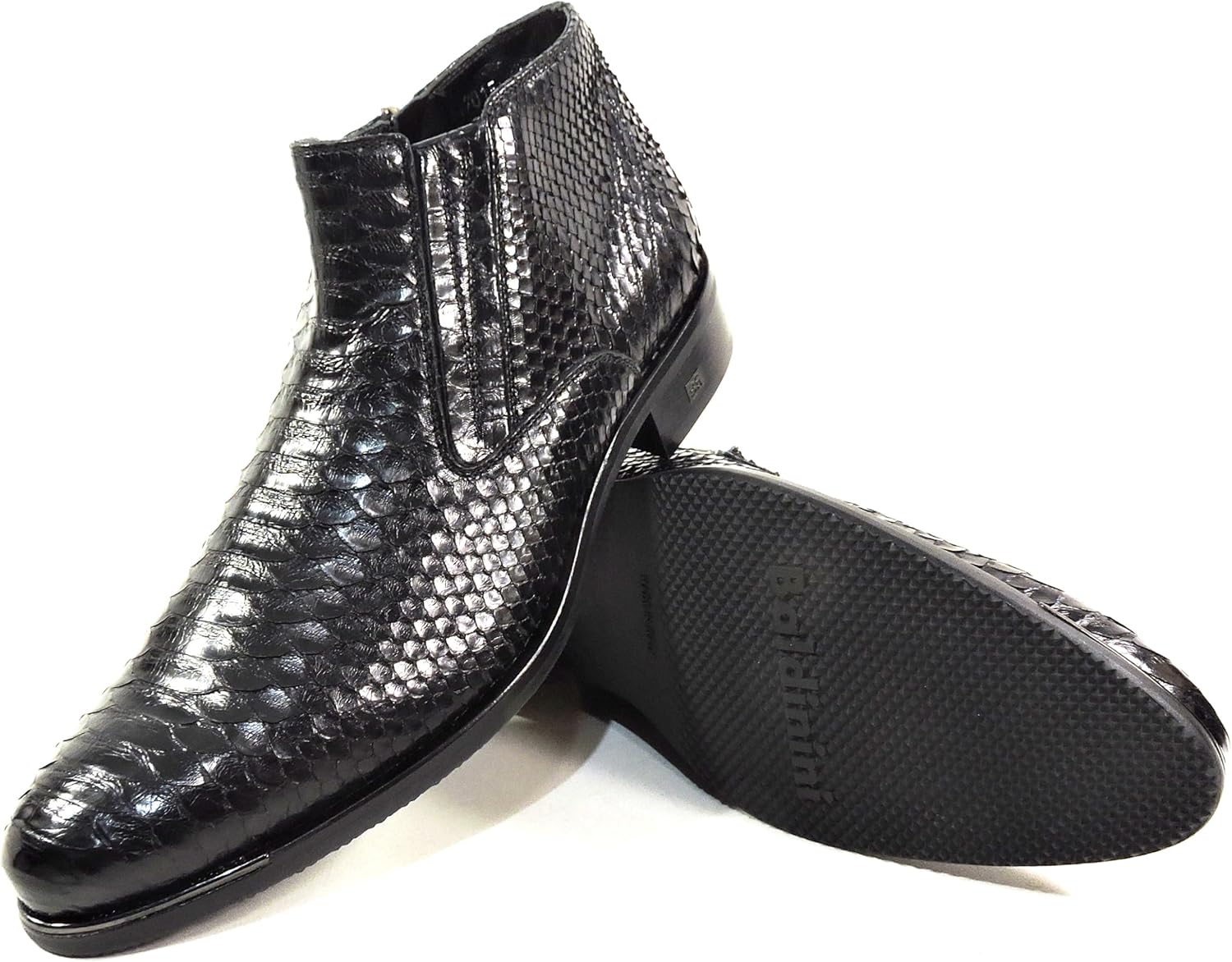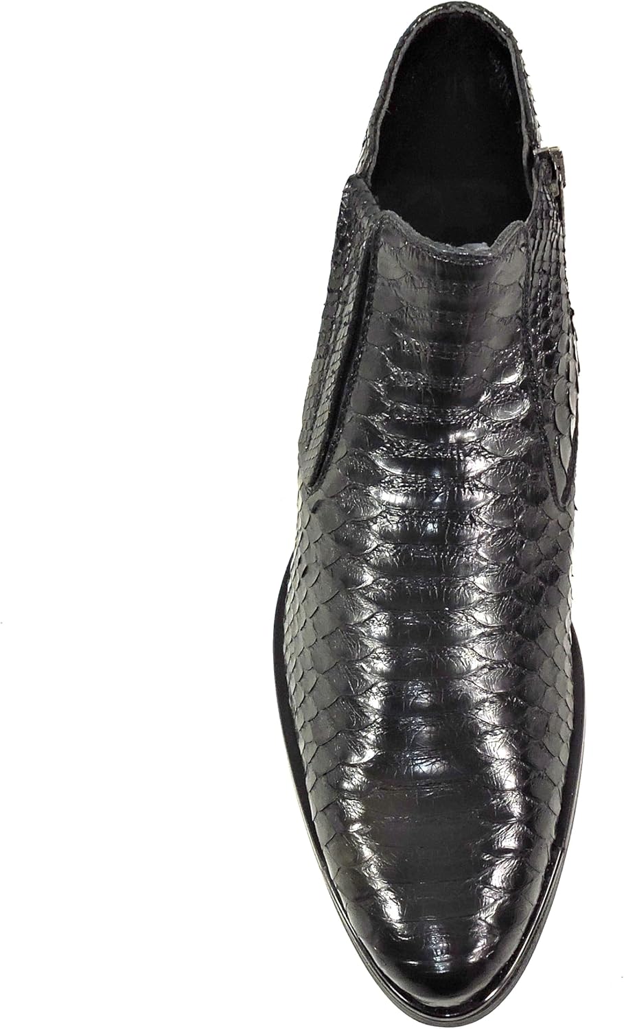 Роскошный дизайн: Сапоги из итальянской лаковой кожи ручной работы с экзотическим текстурированным узором под кожу змеи и элегантным силуэтом до щиколотки Премиальные материалы: Конструкция из лаковой черной кожи с выраженным узором чешуи и прочной резиновой подошвой для долговечного ношения Особенности комфорта: Мягкая стелька и гладкая внутренняя подкладка обеспечивают комфорт на весь день, боковая молния позволяет легко надевать и снимать Универсальный стиль: Элегантный профиль подходит как для официальных мероприятий, так и для стильной повседневной носки, с характерным заостренным носком Мастерство изготовления: Тщательная строчка, качественная фурнитура и профессиональная сборка гарантируют высокую прочность и изысканный внешний вид