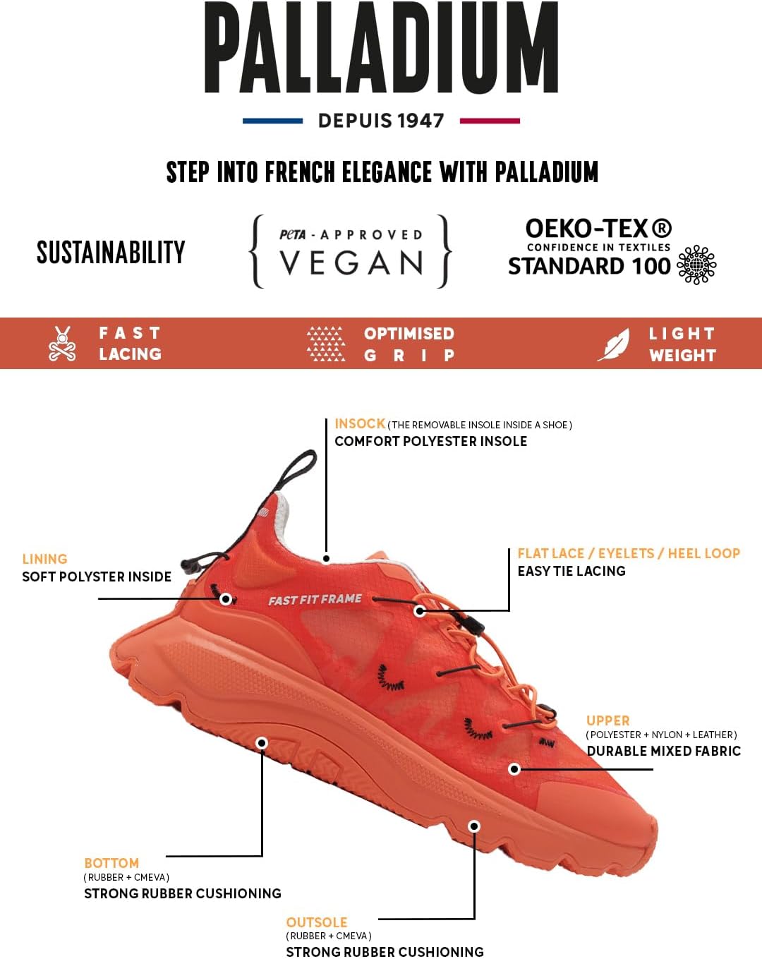 ИСПОЛНЯЙТЕСЬ УВЕРЕННОСТЬЮ - заявите о своей личности, о своем настроении и выделитесь из толпы. От мош-пита до открытой дороги, городской джунгли и сцены мы поощряем любопытство, смелость и желание создать шум ГОРОДСКАЯ ПОЛЕЗНОСТЬ создано для городских исследователей, которые ценят моду так же, как комфорт и функциональный дизайн, позволяющий бережно относиться к нашей планете ЛЕГКОСТЬ пройдите любое расстояние в этих кроссовках армейского стиля с быстрозастегивающимися крюками и эффектной резиновой подошвой, которая поднимается по бокам, создавая яркий привлекательный образ ОСОБЕННОСТИ верх из нейлона Rip Stop в сочетании с неопреном и сеткой для надежной фиксации, воздухопроницаемости и быстрого снятиянадевания легких кроссовок. Защитный носок для долговечности и агрессивная резиновая подошва с вырезами из EVA для прочности С 1947 ГОДА Palladium всегда рядом, чтобы артисты могли мечтать масштабнее, а смелые граждане бороться за справедливость и свободный мир.