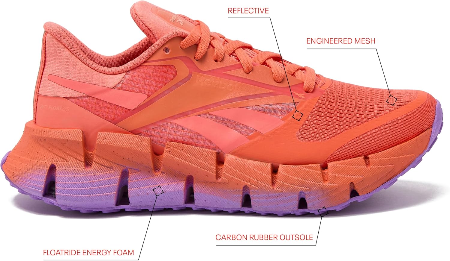ПОДПИСАННЫЙ СТИЛЬ REEBOK - Женские кроссовки Floatzig 1 созданы, чтобы вдохновлять всех шнуровать обувь и выходить на улицу для повседневных пробежек, прогулок, тренировок и повседневной носки. Доступны в черном, белом и модных цветах. ЛЕГКИЕ И КОМФОРТНЫЕ - Дышащий верх из сетки с отражающими элементами позволяет бегать в любое время, а усиленная панель в средней части стопы с двухслойной текстильной подкладкой обеспечивает дополнительную поддержку. Доступны размеры с 5 по 12. ПРЕВОСХОДНОЕ СЦЕПЛЕНИЕ И АМОРТИЗАЦИЯ - Спортивная подошва из карбоновой резины обеспечивает сцепление на различных поверхностях, а премиум-технология пены обеспечивает амортизацию, возврат энергии, поддержку свода стопы и плавный переход от пятки до носка. РАЗРАБОТАНЫ ДЛЯ ДЛИННЫХ ПРОБЕЖЕК - Средняя подошва из пены Floatride Energy в форме Zig снижает избыточный вес и жесткость, позволяя вам продолжать движение, будь то 5 км или полный марафон. ПРОЧНЫЕ - Надежные материалы обеспечивают долгий срок.
