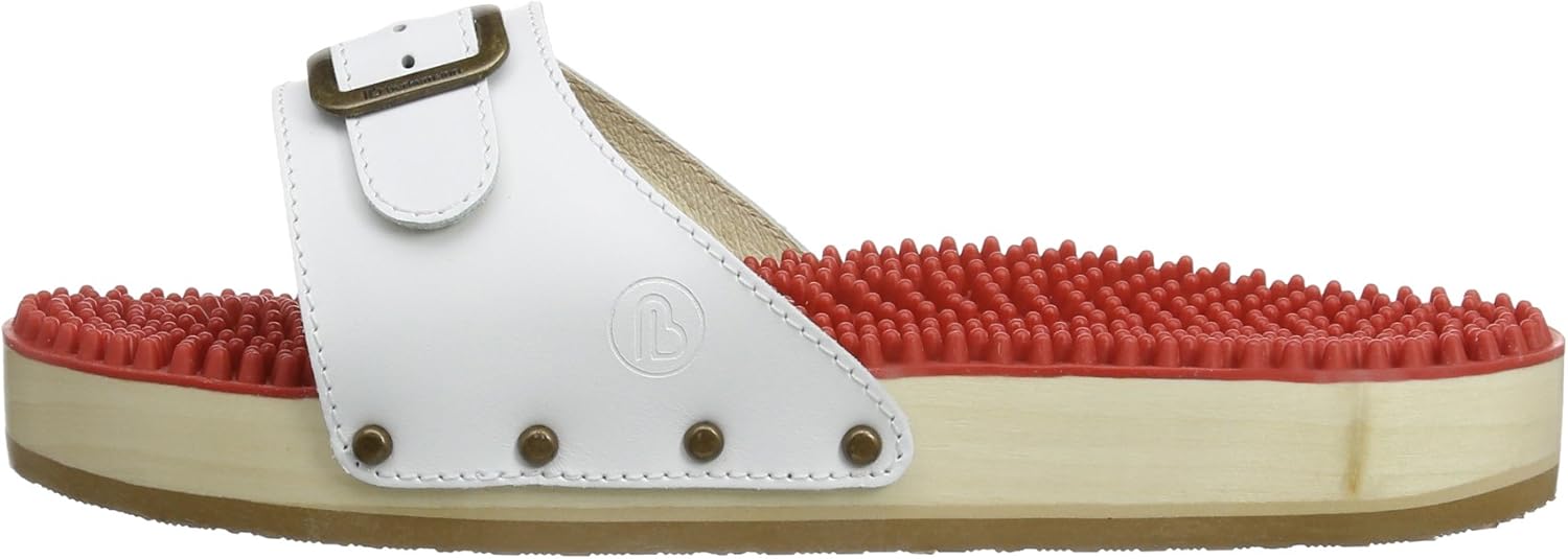 Интегрированная 5-фазная стелька для восстановления естественной анатомии стопы Шипы стимулируют рефлекторные зоны стопы и кровообращение Активирует мышцы стопы и икр, функцию захвата пальцами Легкая и приятная на ощупь благодаря подошве из тополя, амортизирующая средняя подошва для облегчения нагрузки на суставы Настоящая кожаная верхняя часть с заклепками и стильной металлической пряжкой