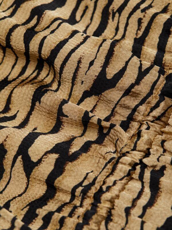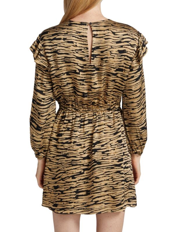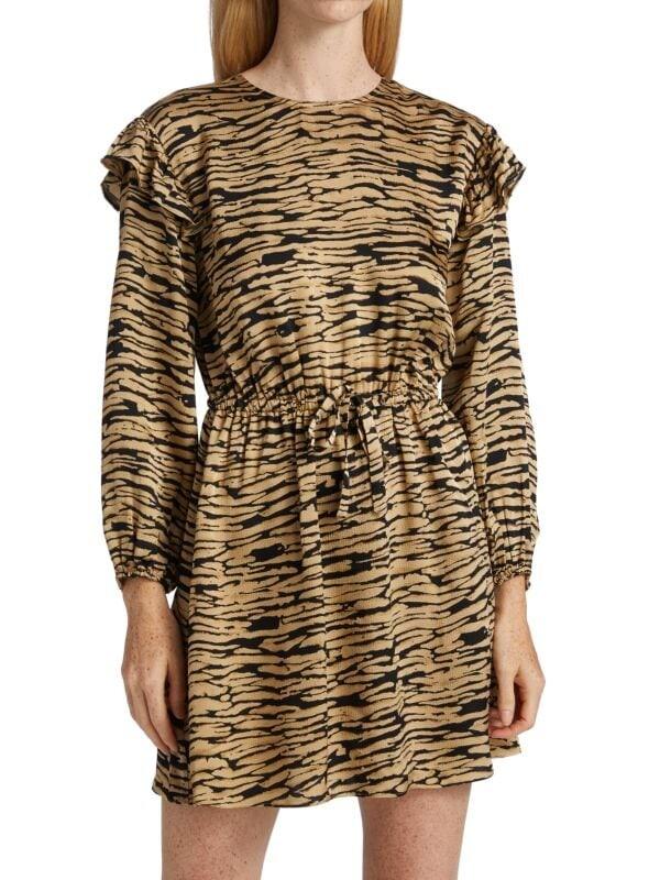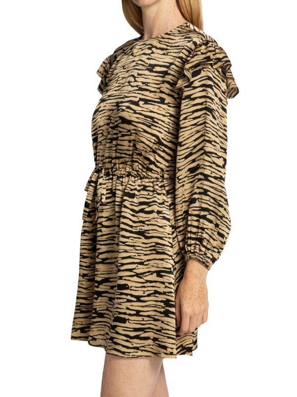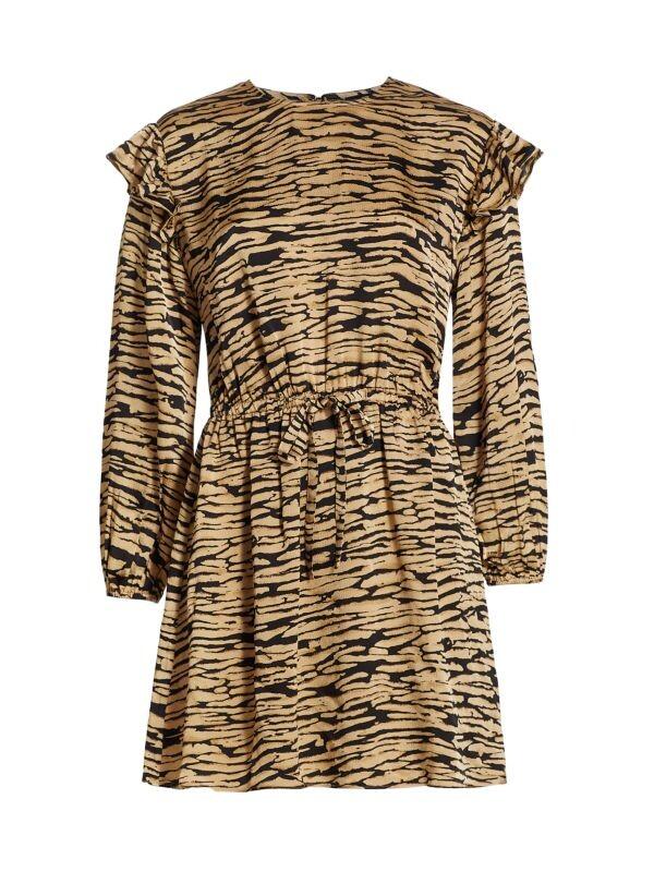 Мини-платье с абстрактным принтом, оборками на плечах и удобной резинкой на талии.