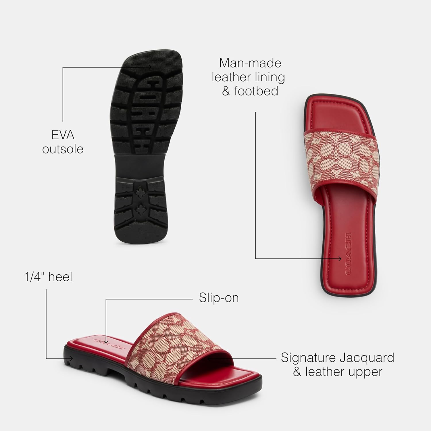 Примечания редактора: Повседневные сандалии с приподнятой подошвой. Подошва этих слайдеров обеспечивает отличное сцепление на городских улицах Фирменный верх из канвы: Эти элегантные слайды изготовлены из фирменной канвы с покрытием Комфорт на целый день: Повседневные сандалии с каблуком 1/4 дюйма имеют подкладку и стельку из искусственной кожи для комфорта в течение всего дня Совет по стилю: Наденьте эти сандалии с протекторной подошвой, чтобы добавить утонченности любому образу - от брюк до легких юбок Это COACH: Смелость быть собой с 1941 года. COACH - это оригинальный американский дом кожи с наследием мастерства и сообществом, поддерживающим смелость жить искренне