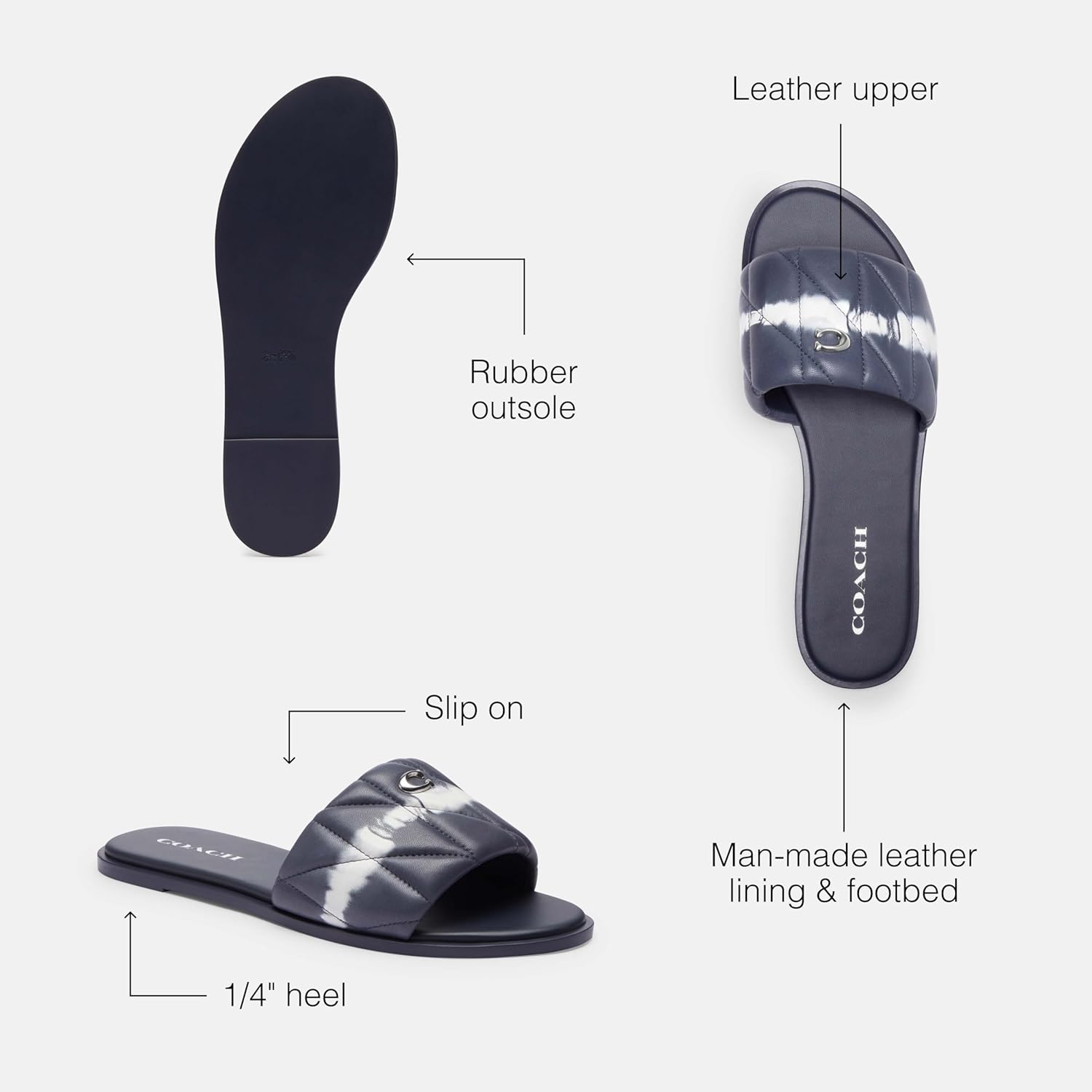 Примечания редактора: Лёгкая модель, которую можно просто надеть и сразу идти, наши кожаные сандалии Holly - это непринуждённо изящная женская обувь. Кожаный верх: Эти универсальные сандалии-туфли от Coach имеют гладкий кожаный верх. Комфорт весь день: Роскошные сандалии на плоской подошве с удобной мягкой кожаной стелькой, резиновой подошвой для лучшего сцепления и нашим отполированным логотипом Signature для добавления исторического шарма. Всё в деталях: Кожаный верх, подкладка и стелька из искусственной кожи, резиновая подошва, на шлёпку, каблук 1/4 дюйма. Это COACH: С 1941 года смелость быть собой. COACH - это оригинальный американский дом кожи с наследием мастерства и сообществом, которое поддерживает смелость жить аутентично.