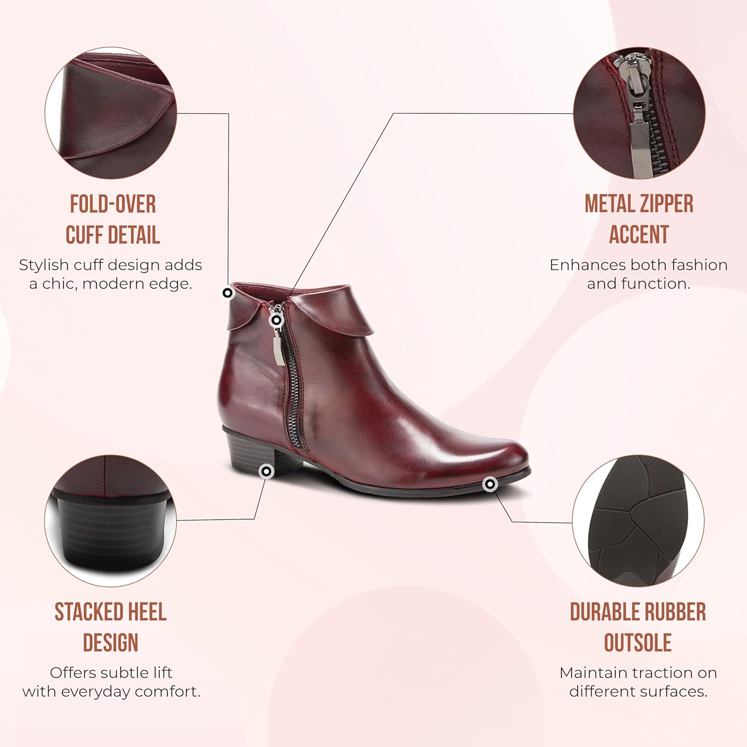 УДОБНЫЙ СТИЛЬ: Эти женские ботинки демонстрируют привлекательный дизайн из полированной кожи с заходящей на ногу частью и деталями, добавляющими уникальный западный акцент вашему образу. Отличное дополнение к вашей обувной коллекции. МЕТАЛЛИЧЕСККАЯ МОЛНИЯ: Легко надевать благодаря отвороту и металлической молнии, экономя время и усилия. Эти ботильоны с высотой голенища примерно 5 дюймов находят баланс между модой и практичностью. КОМФОРТ В ТЕЧЕНИЕ ВСЕГО ДНЯ: В этих женских ботинках мягкая текстильная подкладка и стелька с синтетической кожей и мягкой упаковкой. Мягкая стелька обеспечивает комфорт на протяжении всего дня, делая эти ботинки не только стильными, но и практичными для длительного ношения. ПРОЧНАЯ РЕЗИНОВАЯ ПОДОШВА: Женские ботинки оснащены резиновой подошвой с полированным устойчивым каблуком, который движется вместе с вашей стопой. Высота каблука примерно 1 14 дюйма.