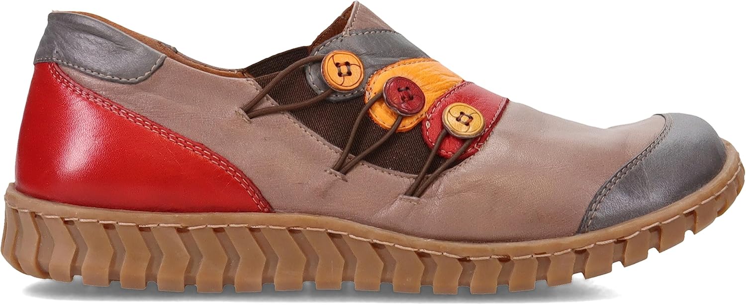 Премиальная кожа высокого качества, эффектная цветовая блокировка, яркие пуговицы, гибкая удобная подошва, съемная стелька с мягкой набивкой.