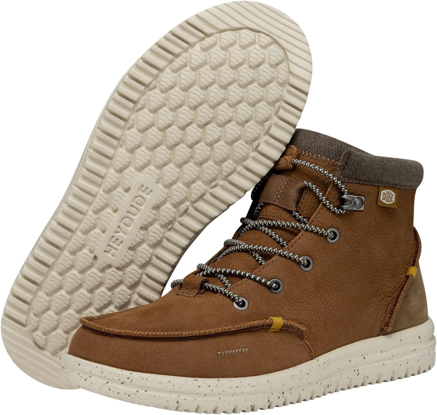 Теплые ноги благодаря выбору ботинок Hey Dude Bradley Classic Tumbled. Наша удобная система надевания и свежий вид при любой погоде. Водоотталкивающий верх из премиальной кожи сочетается с легкой, гибкой подошвой для комфортного и стильного образа в любой сезон. Подкладка из шерсти и полиэстера с полиуретановой стелькой. Эластичная шнуровка спереди с задней петлей для удобства. Ботинки по щиколотку. Логотип на задней части.