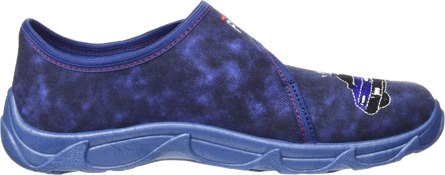 Тапочки для мальчиков с прочным текстильным верхом и широкой застежкой на липучке. Отлично держатся и легко надеваются и снимаются. Стелька гибкая и не оставляет следов. Стильная вышивка.