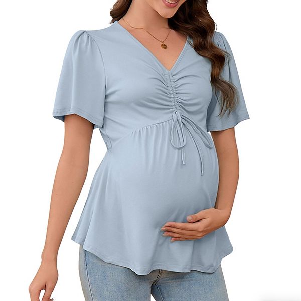 Беременная майка с V-образным вырезом и завязками спереди, летняя, с коротким рукавом Clearflower, Light Blue