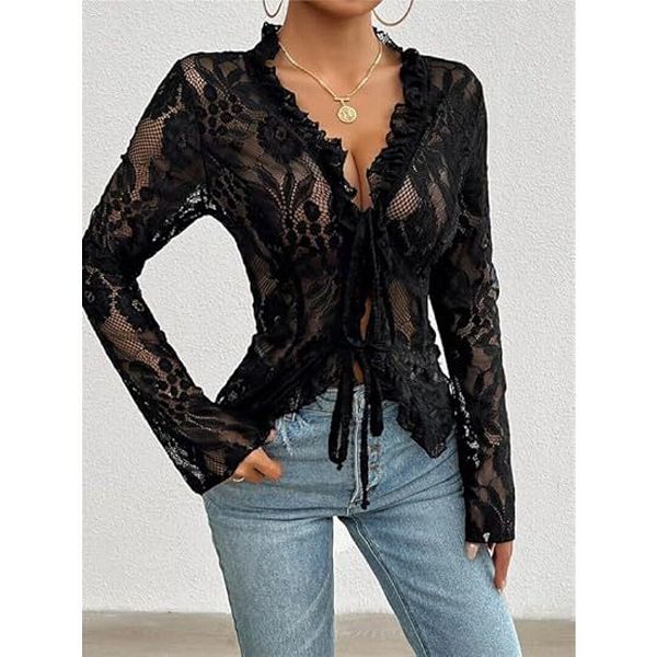 Изготовлено из эластичного прозрачного кружева (95% Полиэстер и 5% Спандекс) для привлекательной и приятной для кожи посадки. Модель с открытой передней частью на завязках, оборками, длинными рукавами и укороченным силуэтом идеально подходит для романтического, женственного образа.