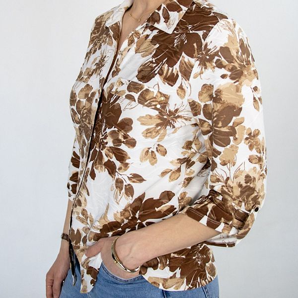 Добавьте художественный штрих в свой гардероб с помощью нашей цветочной блузки Tanya Tan. Стильный коричнево-белый цветочный принт в акварельном стиле. Эта блузка имеет классический воротник и два нагрудных кармана. Рукава с отворотами добавляют ей универсальности, делая ее идеальной для любого весеннего дня.
