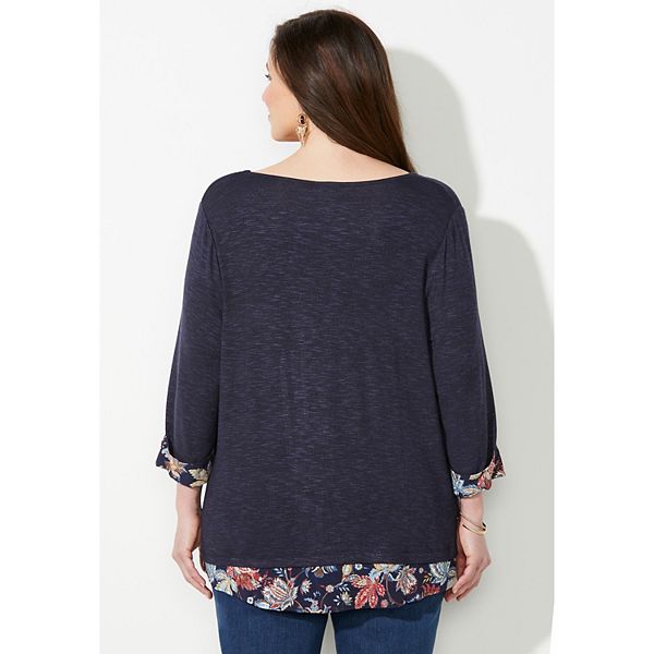 Повседневный многослойный образ в одном удобном топе. Изготовленная из одной из наших самых уютных тканей, эта мягкая трикотажная туника имеет контрастную отделку рубашечного типа по низу и манжетам. Удлиненный крой обеспечивает комфорт и закрытость. ТКАНЬ: Мягкая и уютная, эта теплая на ощупь ткань настолько легкая, эластичная и комфортная, что мы называем ее «Невероятно мягкая». (Потому что это так и есть.) ПОСАДКА: Свободный силуэт. Вырез-лодочка. Рукава 3/4. Длинная туника с подолом-конвертом. Состав: вискоза, полиэстер, спандекс. Машинная стирка. Импортный товар. Топ больших размеров. Длина спереди (по телу): стандартная 33, для невысоких 31. Большие размеры 0X-6X, для невысоких больших размеров 0XWP-3XWP. Catherines