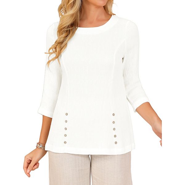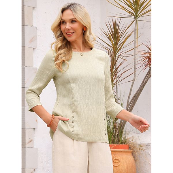 Эти блузки идеально подходят как для дневных, так и для вечерних мероприятий, добавляя элегантности и стиля любому гардеробу. Текстурированная блузка с классическим круглым вырезом, рукавами 3/4 и декоративными пуговицами вдоль рельефных швов обеспечивает свободный крой и элегантный стиль, который выделит вас из толпы. Эта шикарная и стильная повседневная блузка подойдет как для вечернего выхода, так и для повседневной носки, что делает ее подходящей для работы, деловых встреч, офиса, официальных мероприятий, прогулок, шопинга и многого другого.