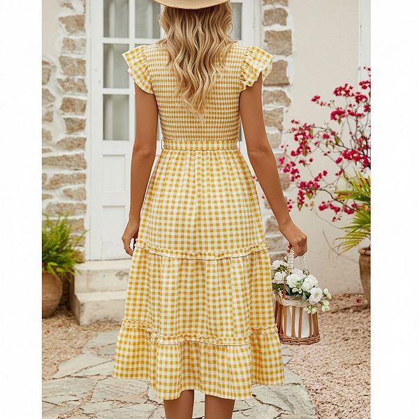 Характеристики товара: Женское платье А-силуэта с V-образным вырезом, плиссированной отделкой, многослойными оборками по краям и шнуровкой. Общий стиль элегантный, а многослойность - роскошная и великолепная.