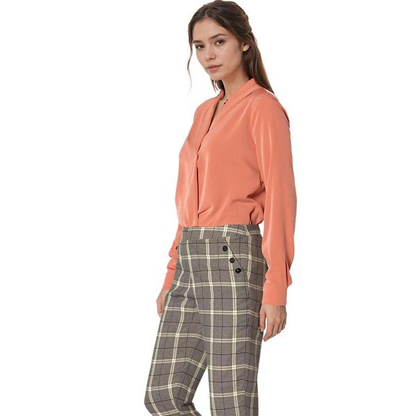 Женская рубашка Pleione с воротником-шалью глиняного цвета, выполненная с высочайшей точностью, излучает элегантность и изысканность.