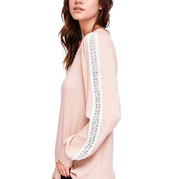 Этот свитер отличается кокетливыми длинными рукавами с манжетами и круглым вырезом горловины. Длинные рукава собраны у манжет и украшены изящной кружевной отделкой. Изготовлен из ребристого материала для дополнительной текстуры.