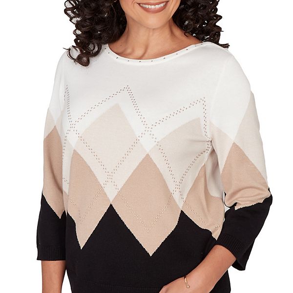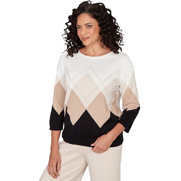 Обновите свой гардероб этим очаровательным свитером от Alfred Dunner, сочетающим классический ромбовидный узор с золотистым блеском. С вырезом-лодочкой и рукавами три четверти он идеально подходит для переходов от неформальных бранчей к вечерним встречам, обеспечивая вам стильный и комфортный образ.