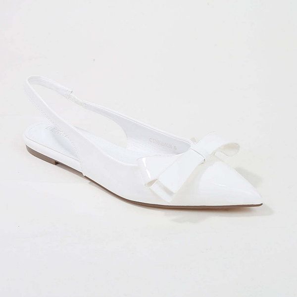Эти элегантные и очаровательные балетки с острым носком выполнены из лакированной кожи и украшены асимметричным бантом, что придает им изысканный, но игривый вид.