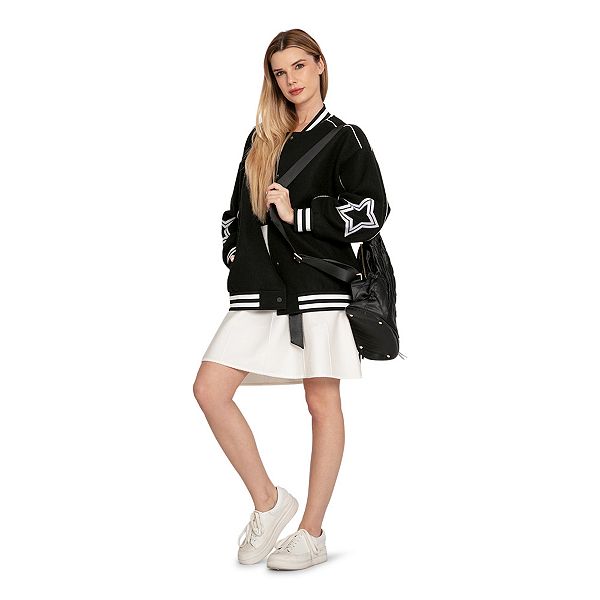 Дополните свой повседневный гардероб курткой-бомбером Hold Me Close Letterman, сочетающей современный дизайн и классические элементы университетской формы, такие как полосатые ребристые манжеты и нижний край, а также культовый мотив звезды.