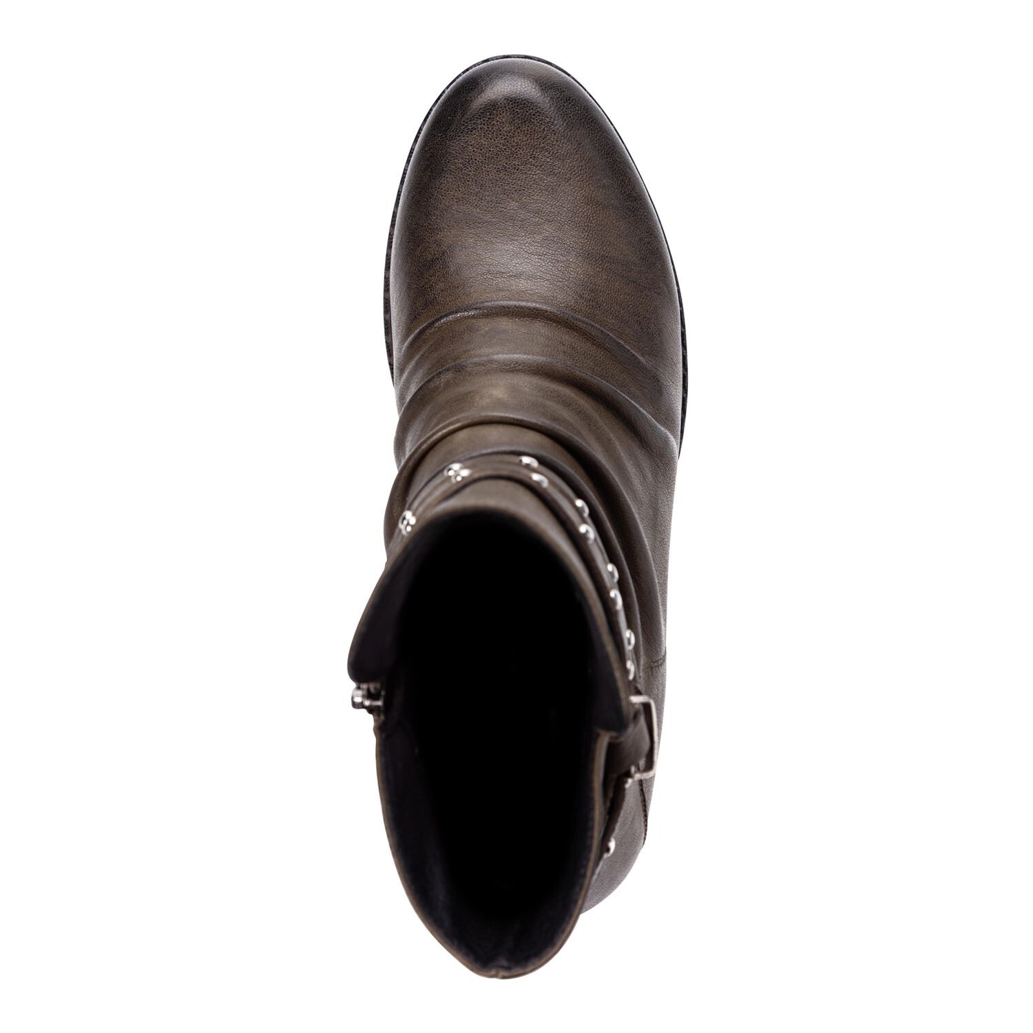 Верх со сборками и ремешками, украшенными заклепками.