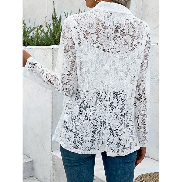 Элегантное цветочное кружево: Этот женский модный блейзер украшен нежным цветочным кружевом, которое добавляет изысканности любому наряду.