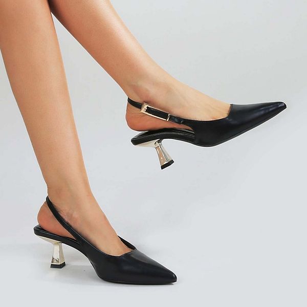Туфли-слингбэки Cassandra-2 выполнены на современном металлизированном каблуке-рюмочке и дополнены удлиненной пряжкой в тон. Силуэт подчеркнут квадратной верхней линией и заостренным носком.