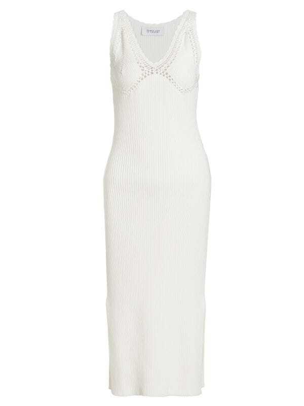 Платье Valencia создано для Derek Lam 10 Crosby из Нью-Йорка. Эта модель длины миди из хлопка, связанного крючком, украшена кружевом по верхней части лифа. V-образный вырез. Без рукавов. Разрез на боковой юбке. Пуловер