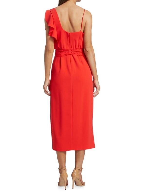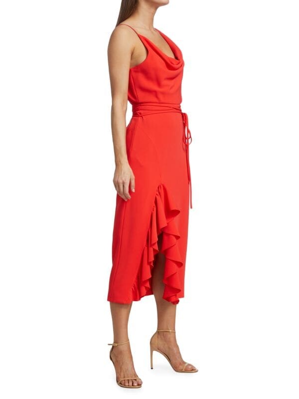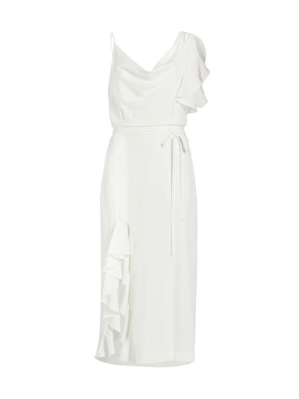 Платье миди Lavonne от Cinq à Sept отличается лифом с воротником-хомутом и одним разрезным рукавом-крылышком. Этот фасон прямого кроя дополнен разрезом до бедра с оборчатой ​​отделкой и поясом с завязками. ХомутикРегулируемый ремешок-спагеттиОдин короткий рукав Потайная застежка-молния сзади. Пояс с завязками. Разрез до бедра спереди.