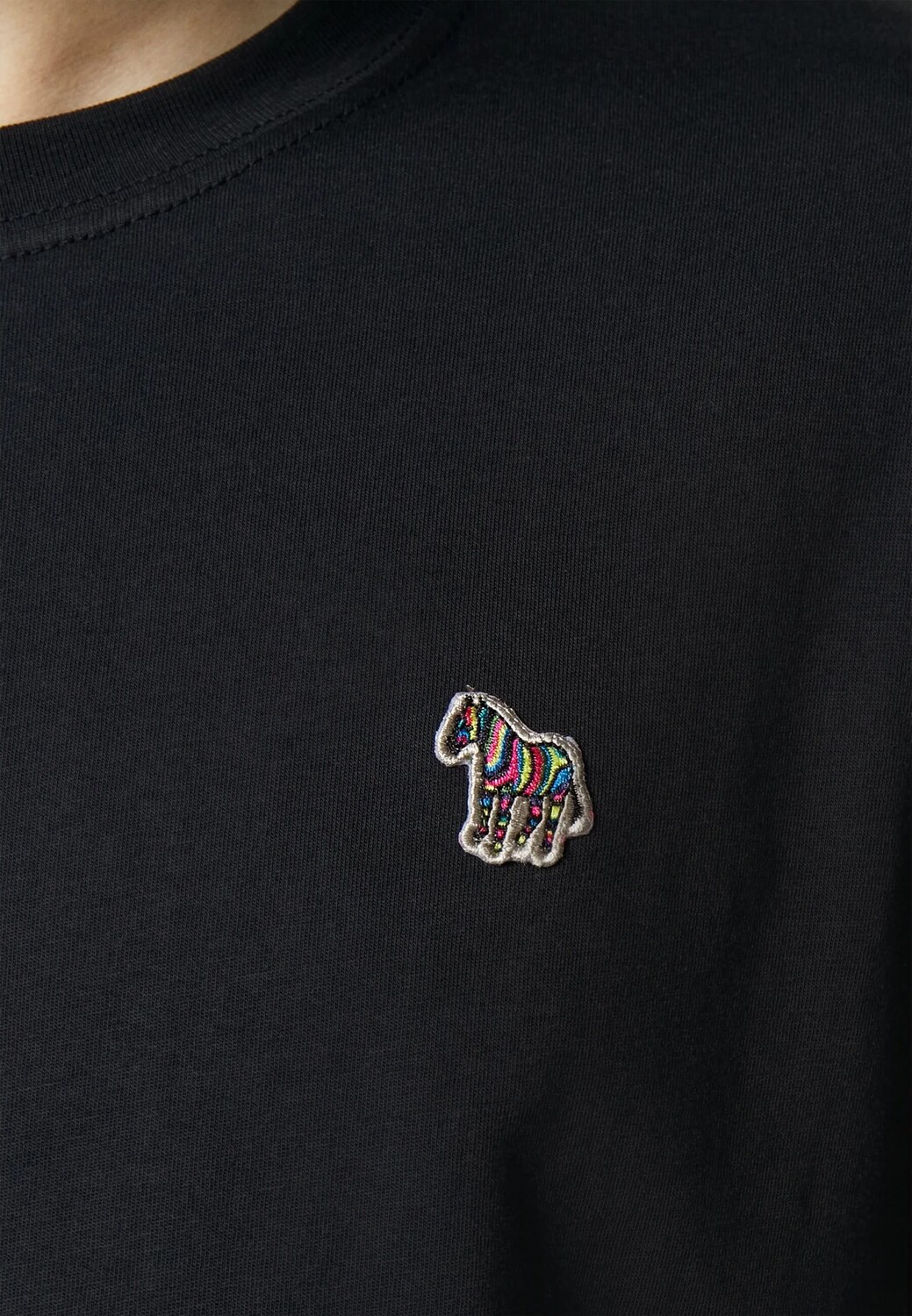 Базовая хлопковая футболка от PS Paul Smith. Модель имеет круглый вырез горловины, короткие рукава и разноцветный принт зебры на груди, который придает образу изюминку.