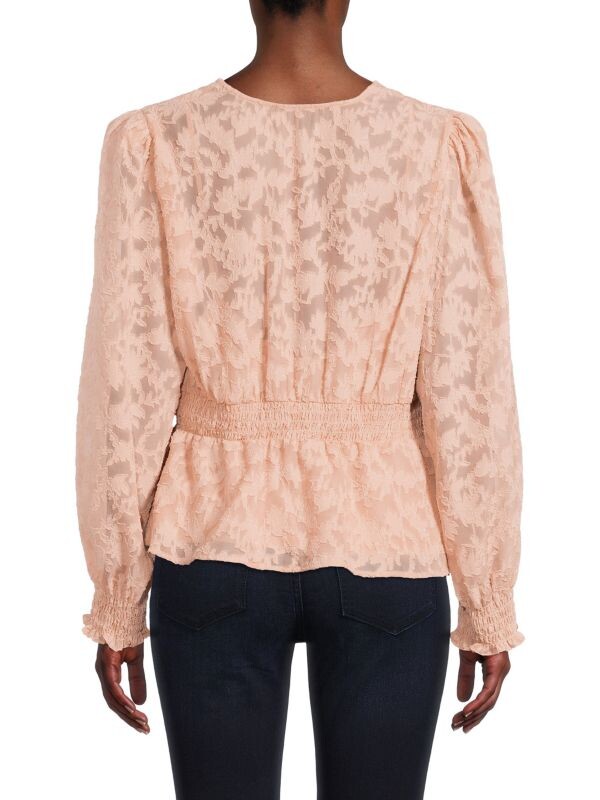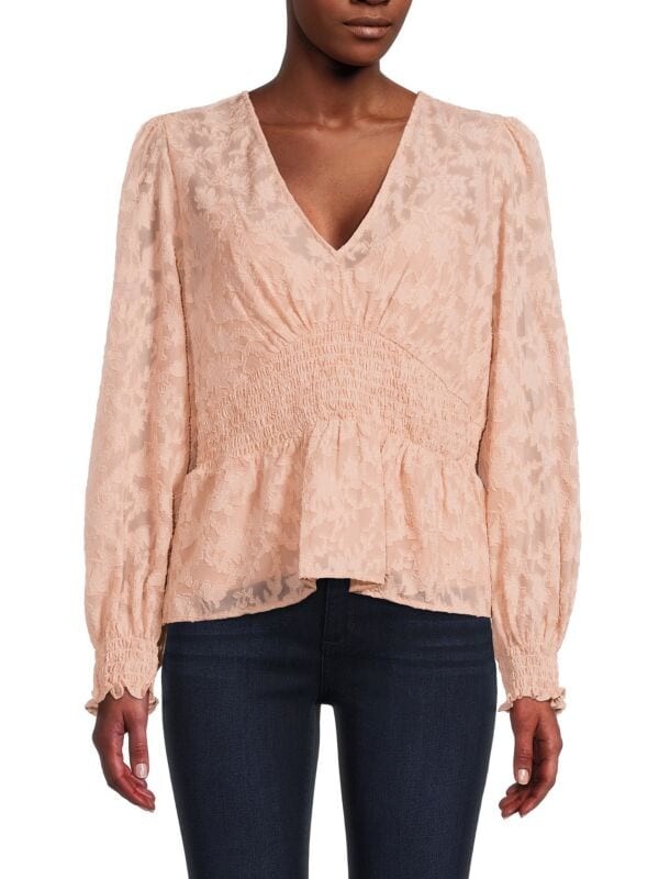 Верх BCBGMAXAZRIA в богемном стиле идеально подходит для ношения с воздушными слоями. Он слегка вплетен в цветочный узор и присборен на талии, чтобы подчеркнуть силуэт. V-образный вырез. Длинные рукава. Присборенная отделка. Пуловеры. На подкладке.