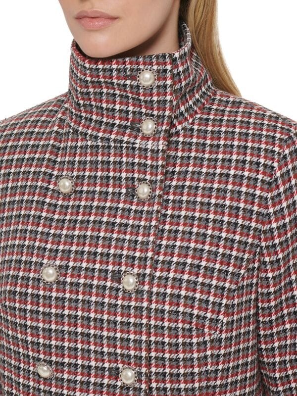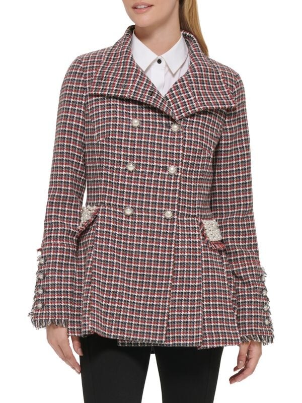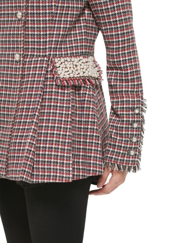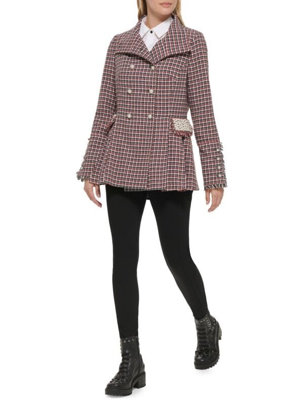 Жакет в клетку уникального винтажного силуэта со складками и хлястиком сзади на талии. Жемчужные бусины и украшения на пуговицах придают этому индивидуальному изделию женственный оттенок. Наряду с эффектным внешним видом эта куртка имеет водоотталкивающую отделку. Широкие лацканы. Длинные рукава. Удлиненные манжеты на пуговицах. Двубортная модель. спереди на пуговицах. Передние карманы с клапанами. Оборка с бахромой. Подкладка.