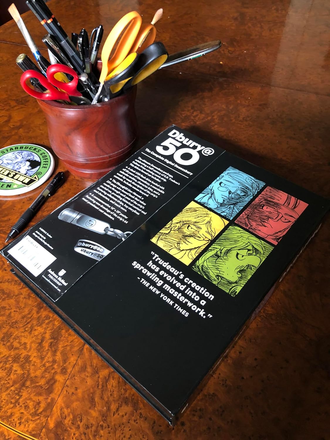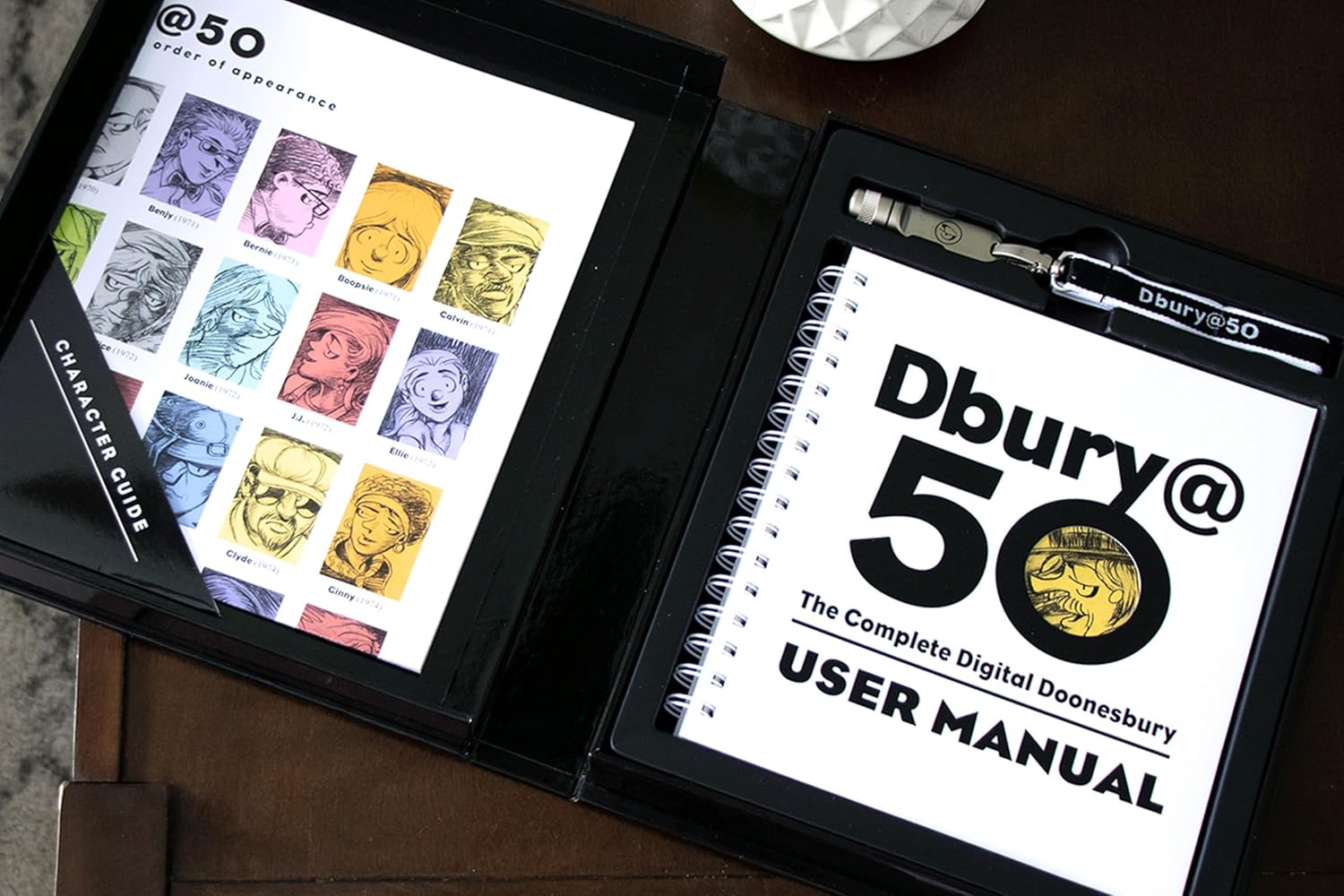- USB-флешка со всеми 50 годами комиксов Doonesbury, включая 26 лет воскресных выпусков, впервые доступных в цифровом формате. Включает в себя архив календаря с возможностью поиска, биографии персонажей и еженедельное описание содержания комикса.