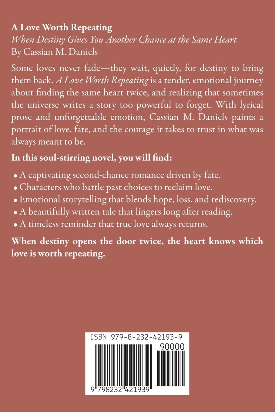 Некоторые виды любви никогда не угасают - они тихо ждут, когда судьба вернет их обратно. «Любовь, достойная повторения» - это нежное, эмоциональное путешествие о том, как дважды найти одно и то же сердце и осознать, что иногда Вселенная пишет историю, слишком сильную, чтобы ее забыть. Лирической прозой и незабываемыми эмоциями Кассиан М. Дэниелс рисует портрет любви, судьбы и мужества, необходимого для того, чтобы поверить в то, что всегда было предначертано судьбой.