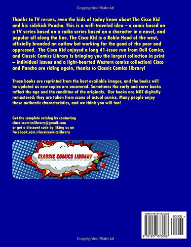 Благодаря повторам телепередач, даже современные дети знают о Сиско Киде и его помощнике Панчо. Это хорошо известная идея - комикс, основанный на телесериале, который, в свою очередь, основан на радиосериале, основанном на персонаже романа, и пользовавшийся популярностью на протяжении всего этого времени. Сиско Кид - это Робин Гуд Дикого Запада, официально объявленный вне закона, но работающий на благо бедных и угнетенных. Комикс о Сиско Киде выходил в издательстве Dell Comics на протяжении 41 выпуска, и Classic Comics Library представляет вам самую большую коллекцию в печатном виде - отдельные выпуски и коллекцию легких вестерн-комиксов! Сиско и Панчо снова в седле, благодаря Classic Comics Library! Эти книги перепечатаны с лучших доступных изображений, и каталог будет обновляться по мере обнаружения новых экземпляров. Иногда ранние и более редкие книги отражают возраст и состояние оригиналов. Наши книги НЕ подвергались цифровой ремастерингу; Они созданы на основе сканов настоящих комиксов. Многим нравятся эти аутентичные детали, и мы думаем, вам они тоже понравятся!