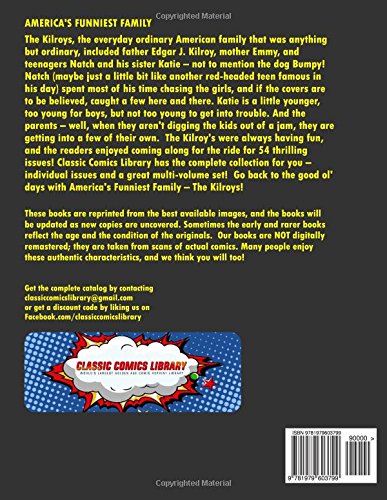 САМАЯ ВЕСЕЛАЯ СЕМЬЯ АМЕРИКИ. Семья Килрой, обычная американская семья, которая была совсем не обычной, включала отца Эдгара Дж. Килроя, мать Эмми и подростков Натча и его сестру Кэти - не говоря уже о собаке Бампи! Натч (возможно, немного похожий на другого рыжеволосого подростка, известного в свое время) большую часть времени проводил, гоняясь за девочками, и, если верить обложкам, кое-кого ловил. Кэти немного младше, слишком молода для мальчиков, но не слишком молода, чтобы попадать в неприятности. А родители - ну, когда они не вытаскивают детей из передряг, они сами попадают в ловушки. Килрои всегда веселились, и читатели с удовольствием следили за ними на протяжении 54 захватывающих выпусков! В Classic Comics Library вы найдете полную коллекцию - как отдельные выпуски, так и великолепные многотомные издания! Вернитесь в старые добрые времена с самой смешной семьей Америки - Килроями! Эти книги перепечатаны с использованием лучших доступных изображений, и каталог будет обновляться по мере обнаружения новых экземпляров. Иногда ранние и более редкие издания отражают возраст и состояние оригиналов. Наши книги НЕ подвергались цифровой ремастерингу; они созданы на основе сканов настоящих комиксов. Многим людям нравятся эти аутентичные характеристики, и мы думаем, что вам они тоже понравятся!