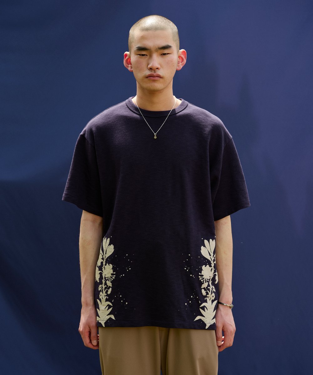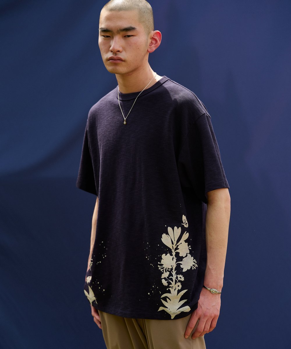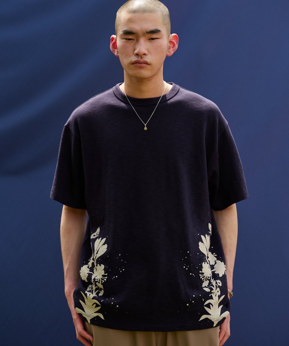 Это платье сшито из ткани с графическим рисунком, нанесенным методом вытравливания, с цветочным мотивом по бокам обоих подолов.