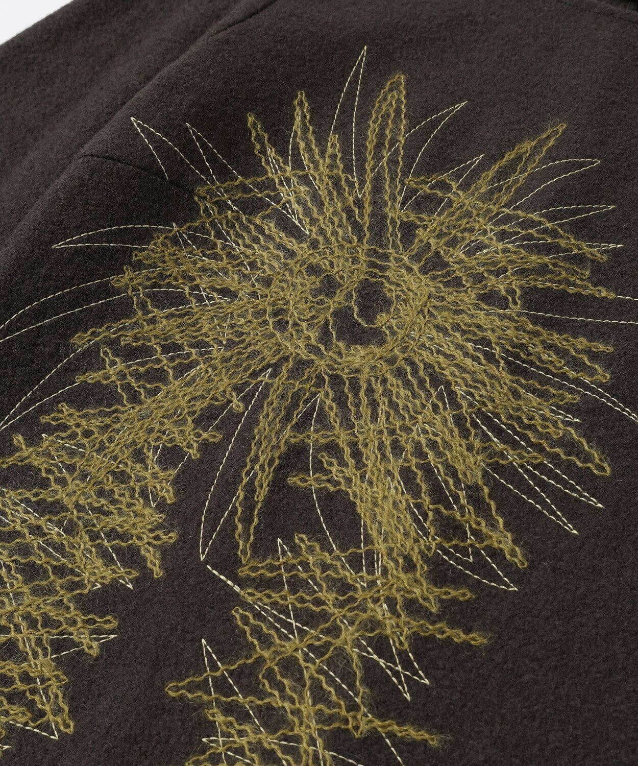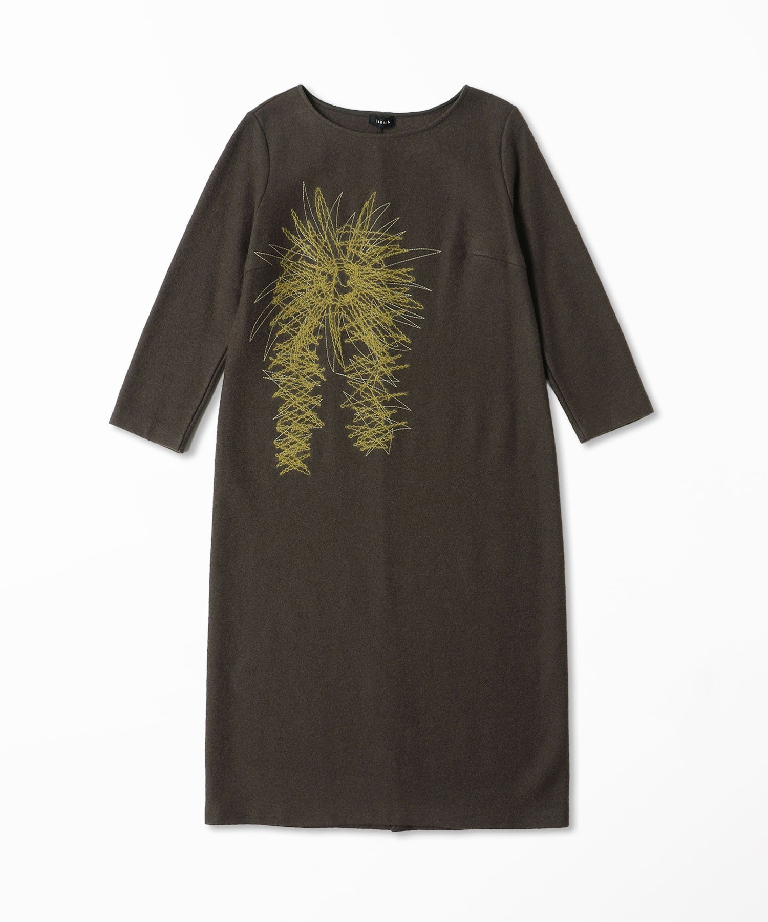 С помощью двух видов пряжи — длинноворсовой, пушистой декоративной нити и обычной нити — платье частично вышито ярким, линейно нарисованным цветочным узором, напоминающим фейерверк. Пожалуйста, будьте осторожны и избегайте трения или зацепления вышитой области за ремни, сумки, стены, стулья или другие шероховатые поверхности.