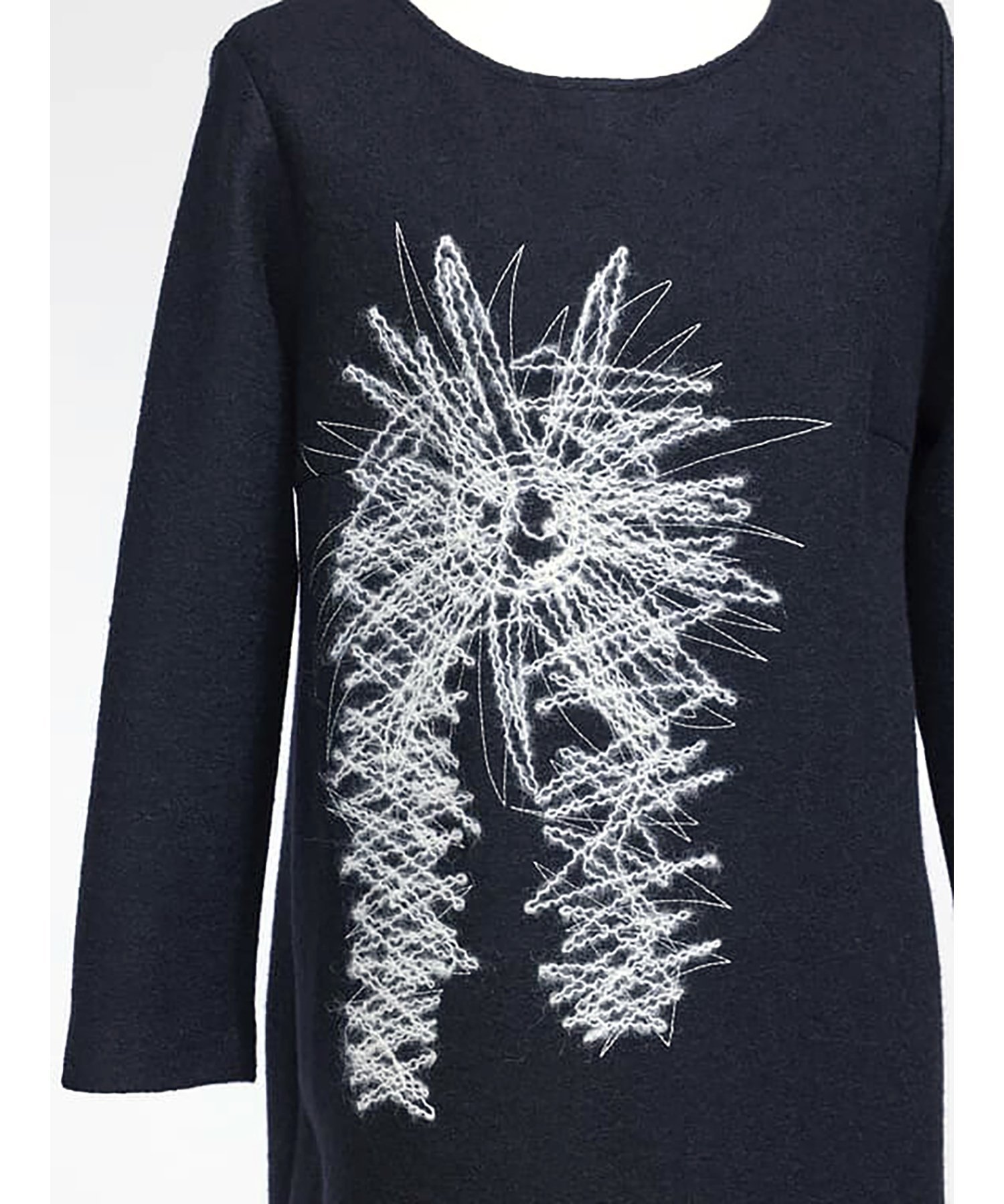 Платье, сшитое из плотной прессованной букле-ткани, с ярким, линейно нарисованным цветочным узором, напоминающим фейерверк, вышитым на передней части.