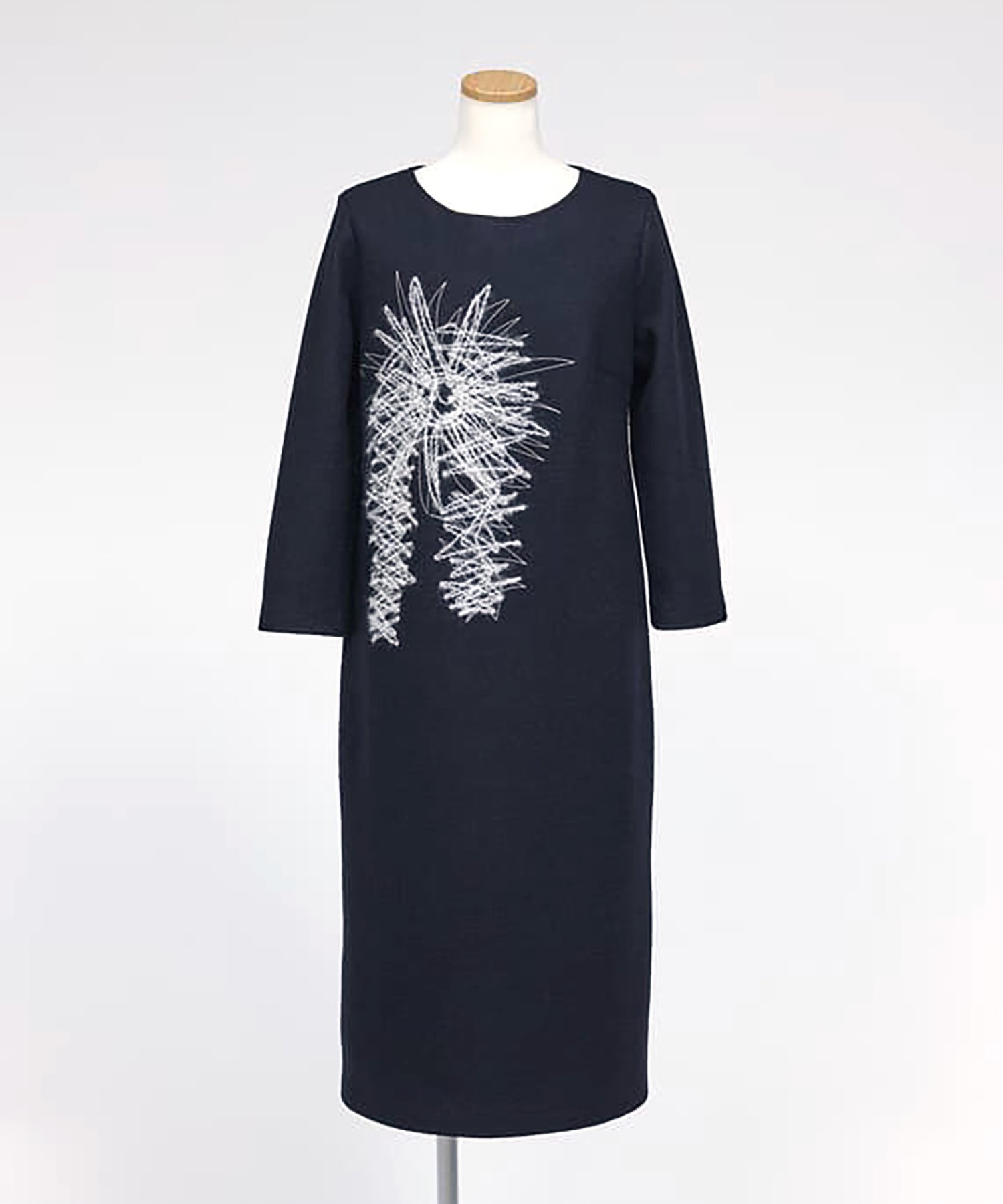 С помощью двух видов пряжи — длинноворсовой, пушистой декоративной нити и обычной нити — платье частично вышито ярким, линейно нарисованным цветочным узором, напоминающим фейерверк. Пожалуйста, будьте осторожны и избегайте трения или зацепления вышитой области за ремни, сумки, стены, стулья или другие шероховатые поверхности.