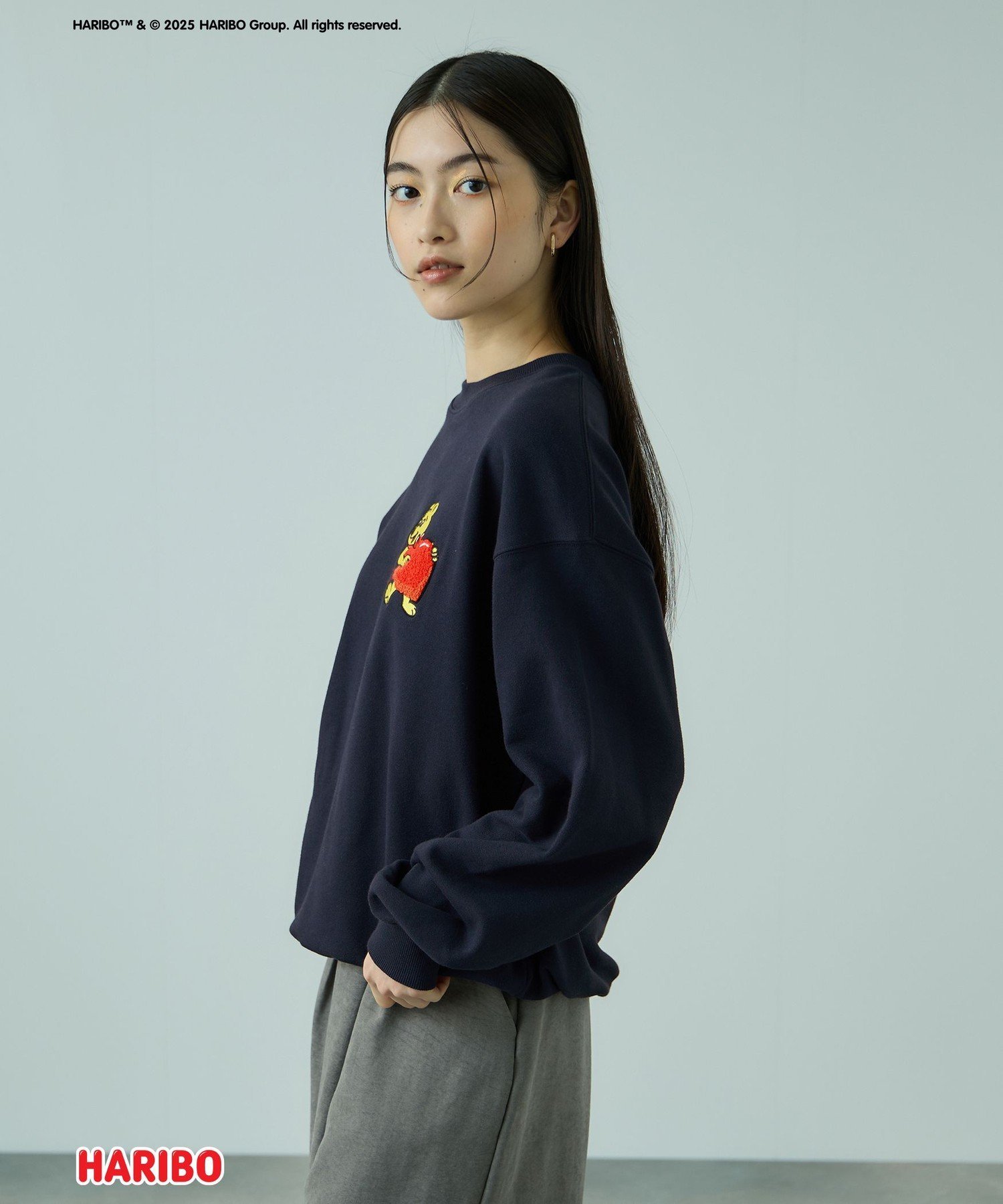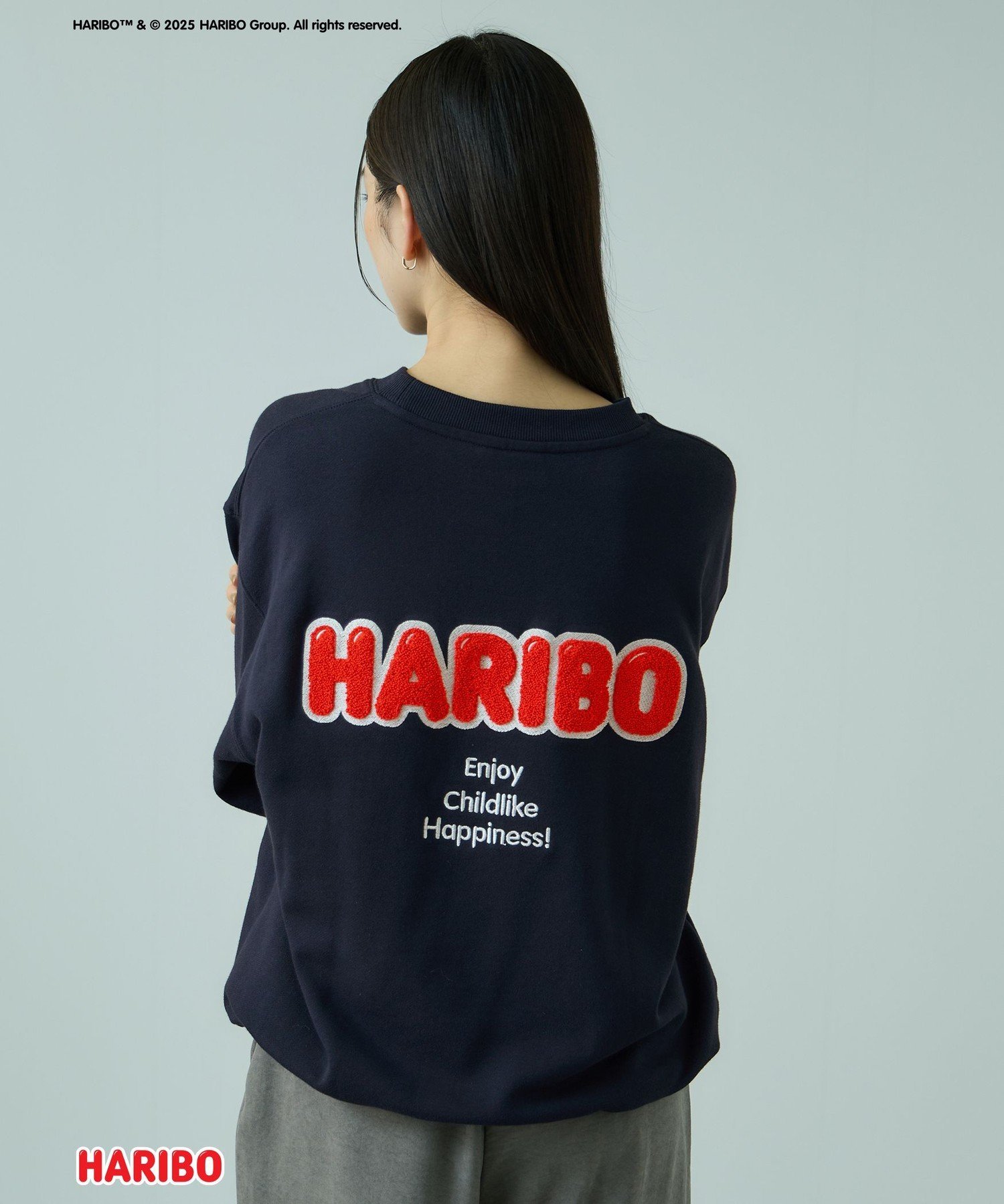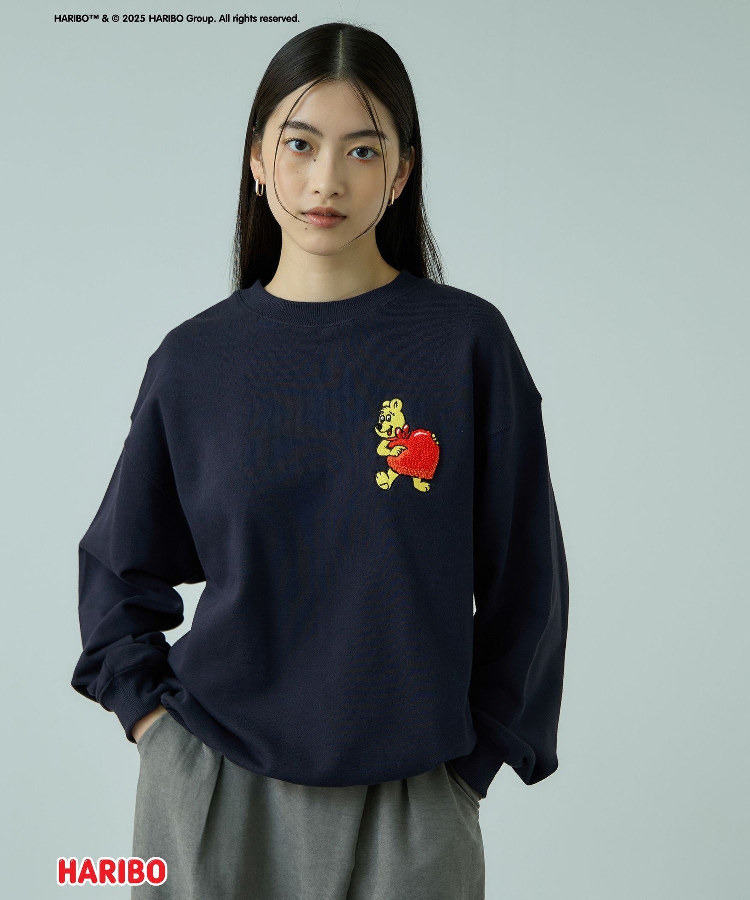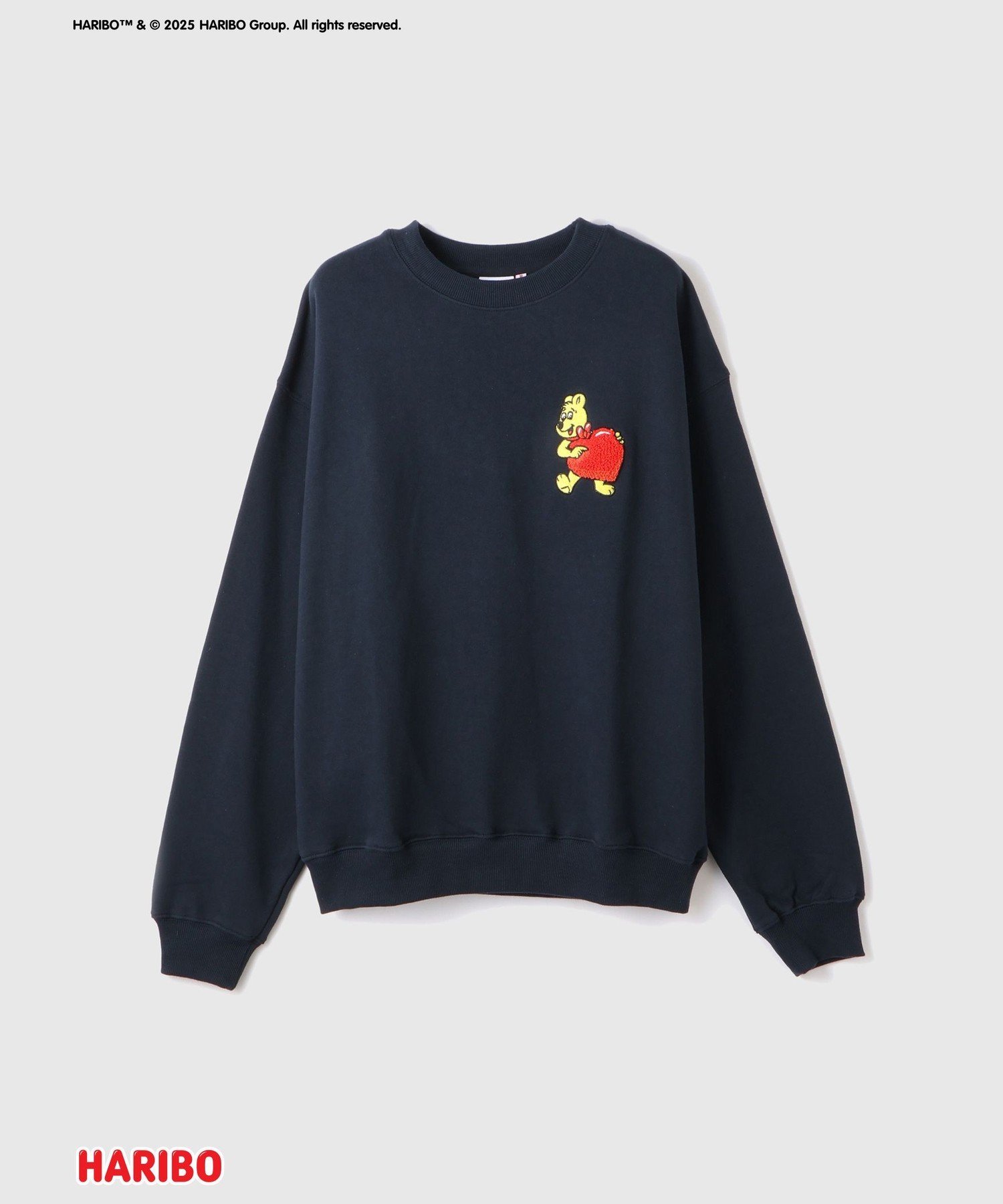 На передней части этой толстовки с графическим принтом изображен золотой медведь, держащий сердце, вышитое стежком сасара, а на спине — только красная часть логотипа "HARIBO", также вышитая стежком сасара, что создает текстурированный вид.
