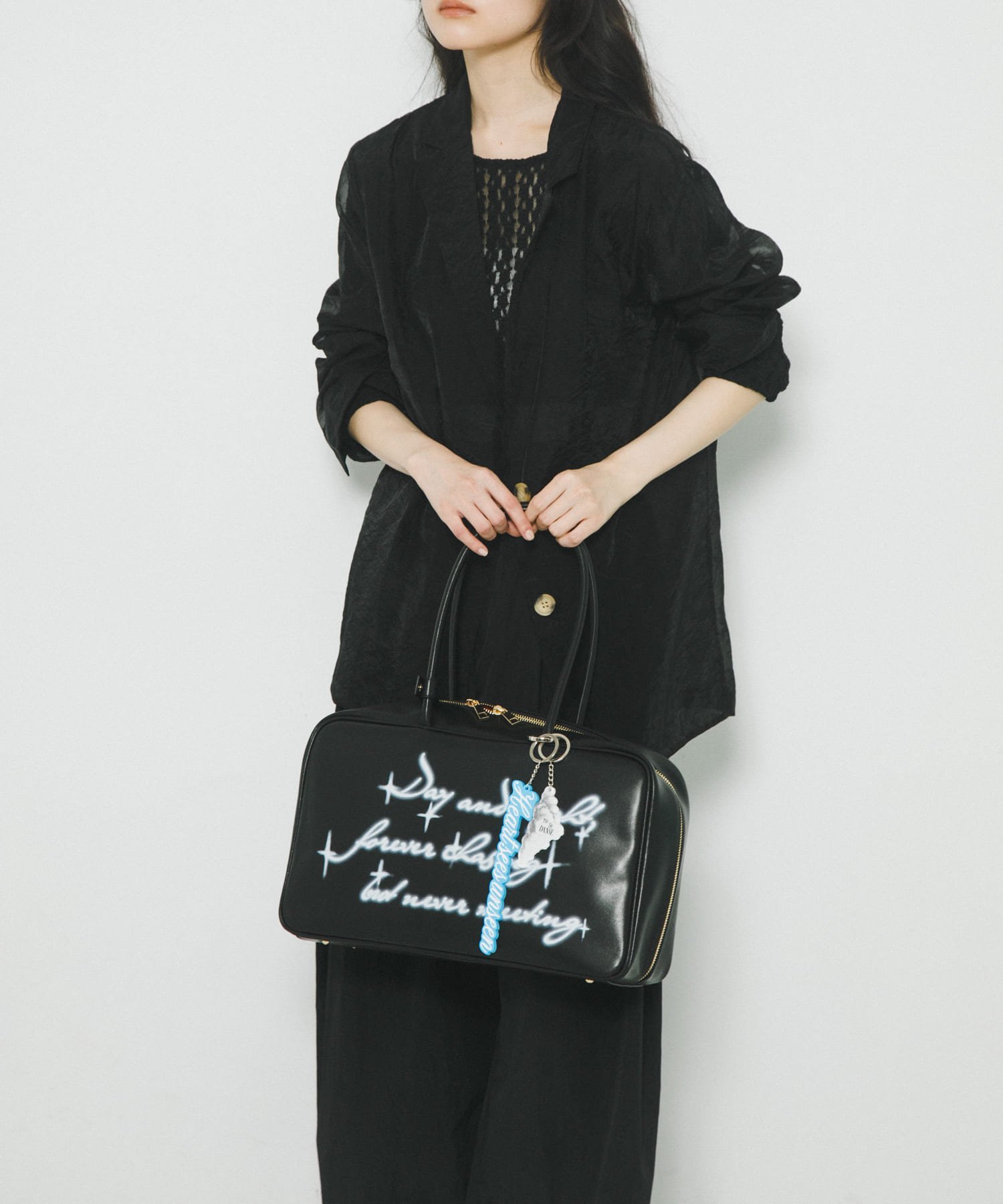 «День и ночь, вечно преследуют, но никогда не встречаются». (Day and night, forever chasing but never meet) — написанные в виде инверсионных следов на сумке.